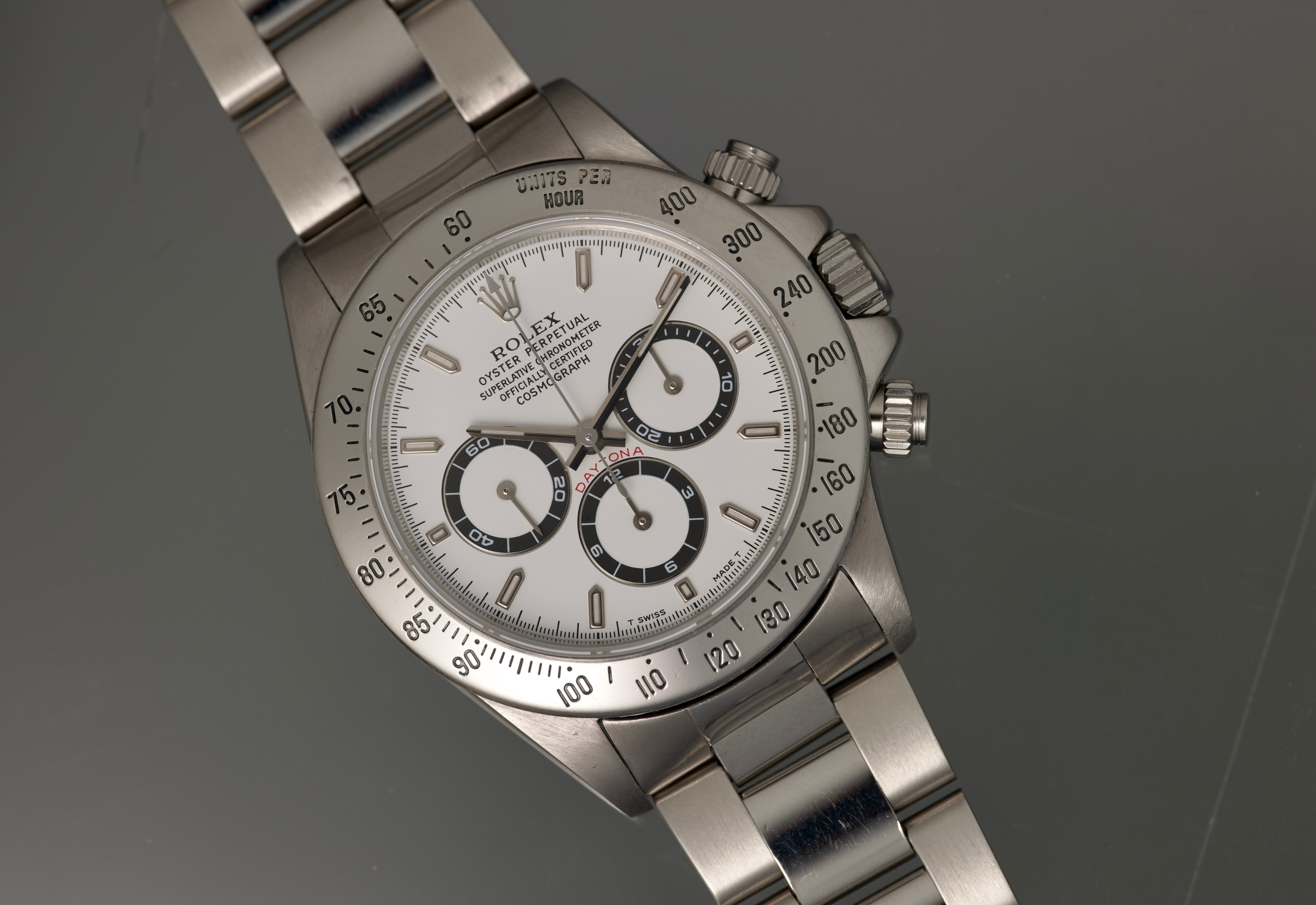 Super nice 16520 Daytona from 1997. The dial and hands are perfect. The case was polished in the past however remains very sharp and clean. The bezel has some aging in certain areas. The bracelet is tight and fully linked. The movement is running as it should. Comes with box, punch guarantee, both booklets and one hang tag.