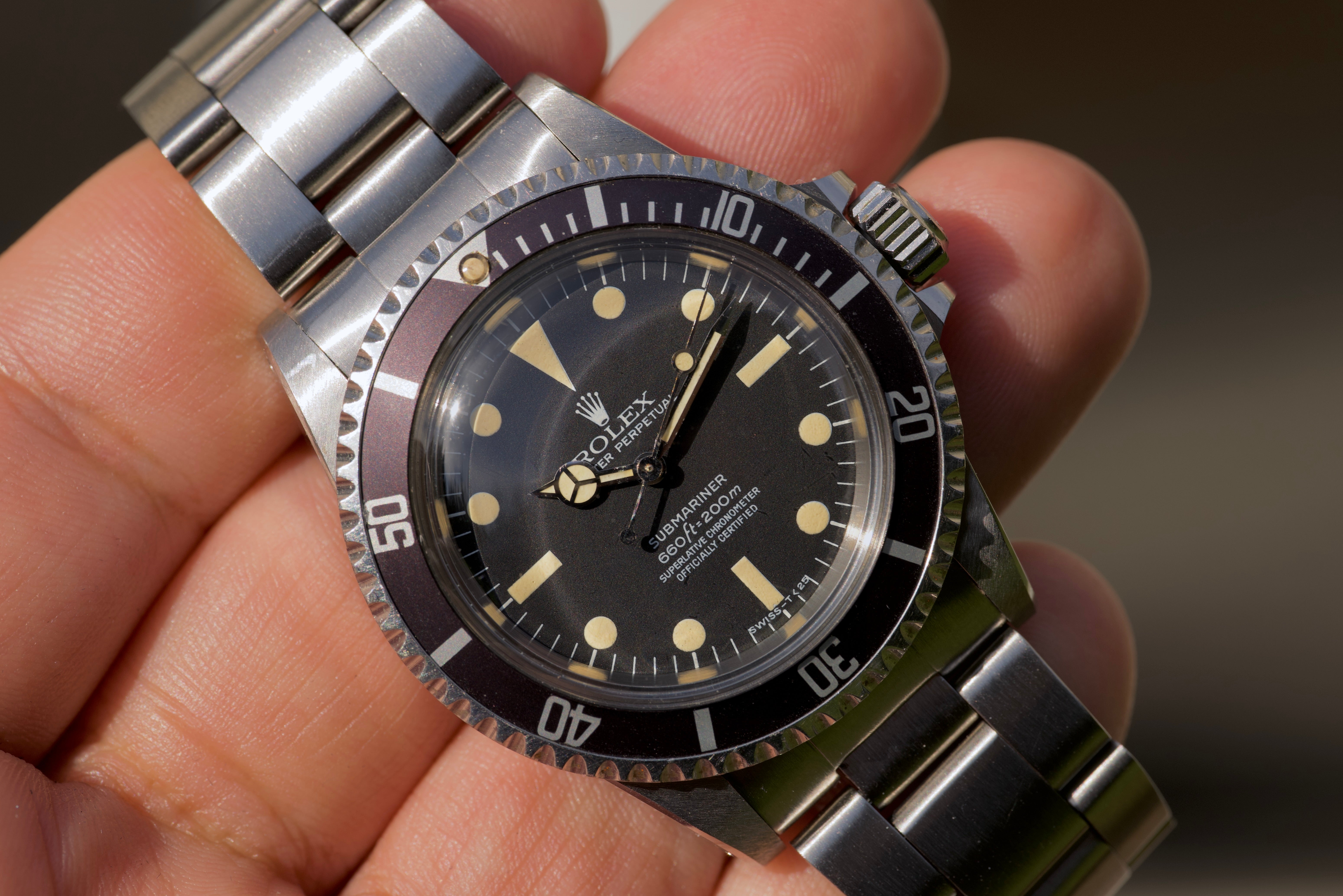 super looking 5512 Maxi MK2 submariner from 1978. The dial and hands have developed some great dark cream patina and the dial surface has no aging whatsoever. The case was recently polished and is super sharp and thick and looks like new. The bezel is sharp and the brown toned insert is very unique. The bracelet appears to be a later 93150/580 with 11 links plus diver extension and zero stretch. Movement is running perfectly and comes with RSC card dated 2021