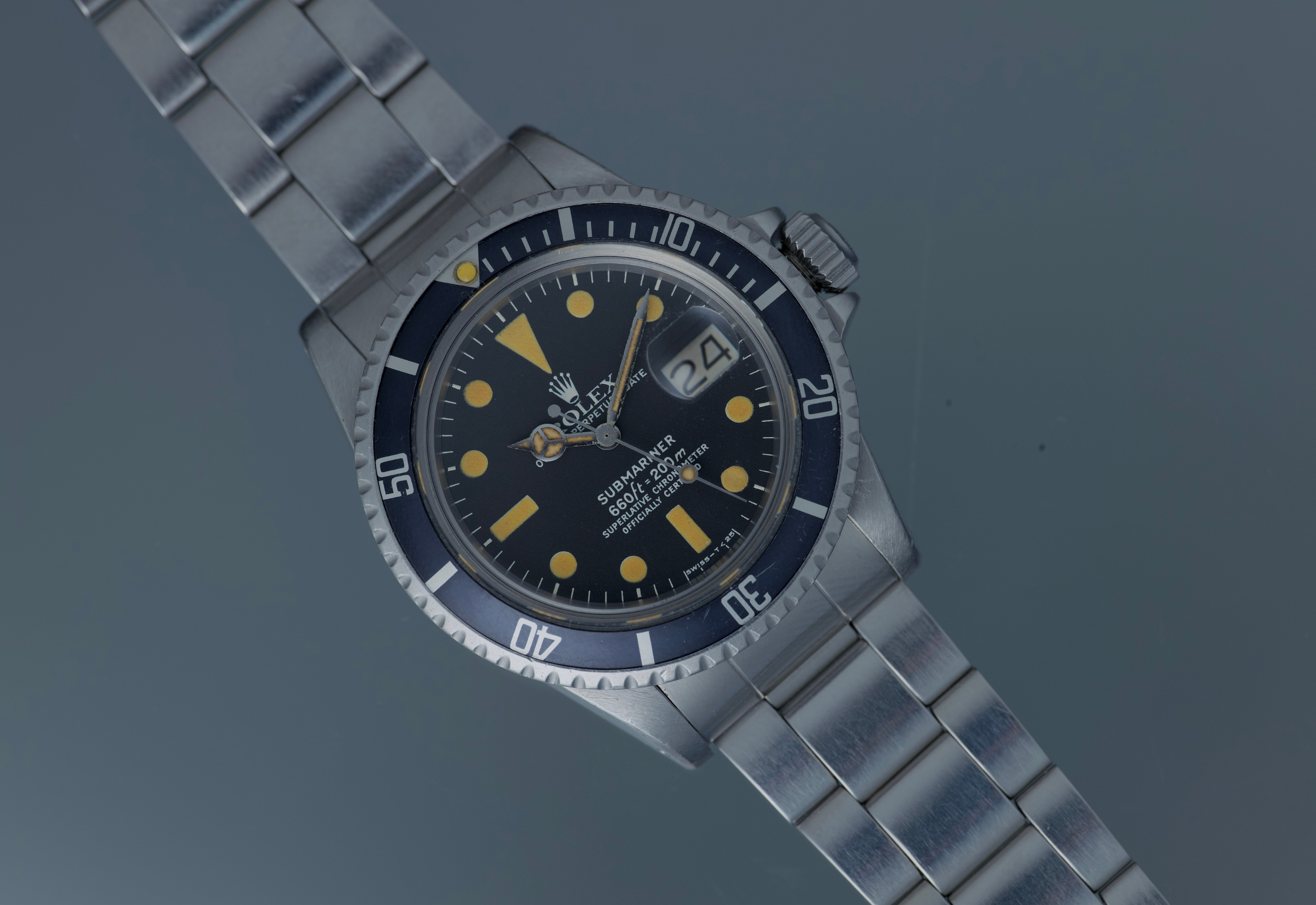 super nice 1680 submariner date. The dial and hands have nice dark aged patina and the hands have some corrosion. The case has wear all over however it's never been polished and the reference and serial are very crisp. The bezel is sharp and the bezel has faded to a dark navy blue. The bracelet is the original 9315/380 oyster band. The movement was recently serviced. Comes with its original box and papers purchased by the original owner in Caracas