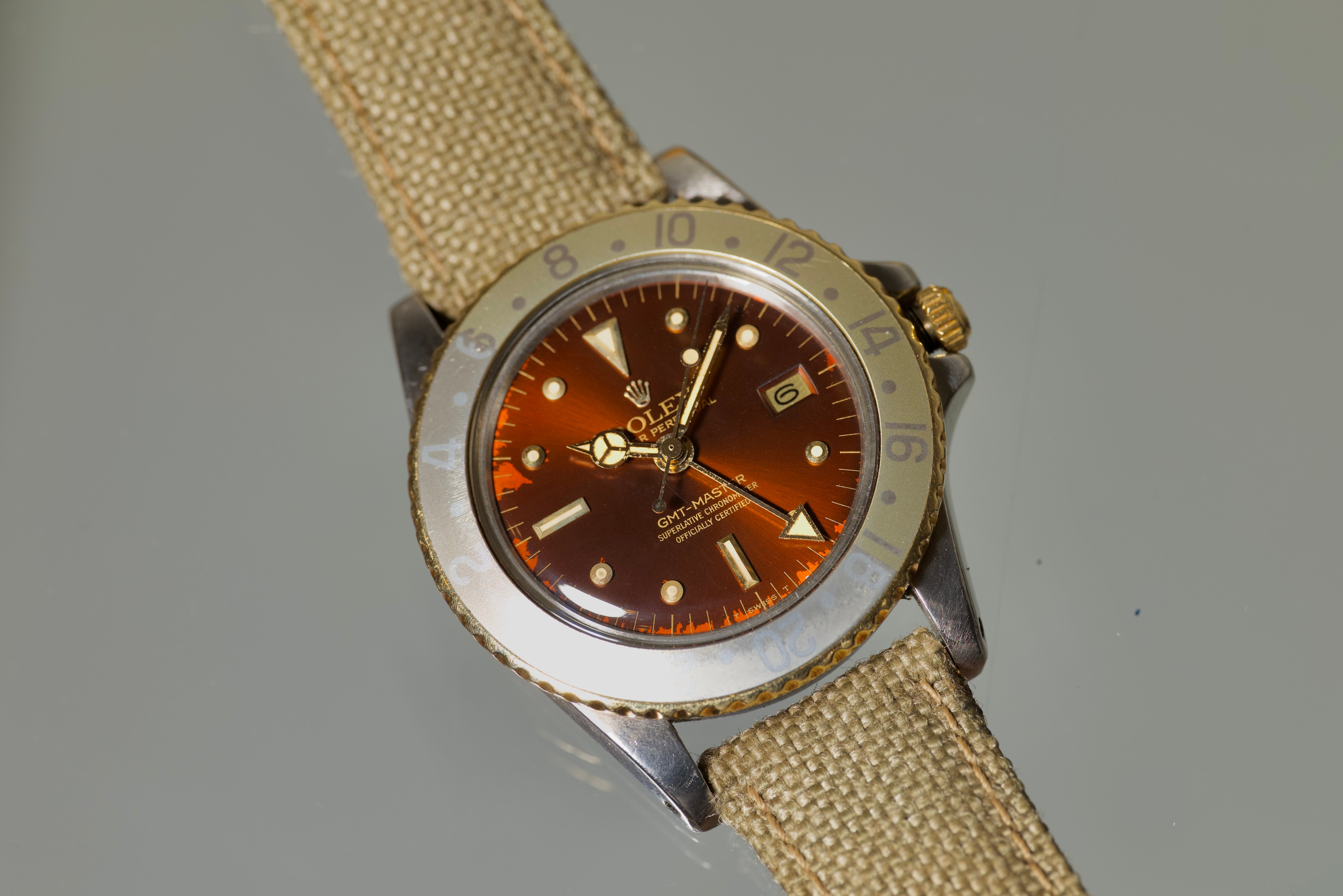 Seldomly seen 79 Rootbeer with tropical sunburst dial. This is the last iteration of the 1675 nipple dial before the quickest took over. The dial and hands have amazingly aged and are really stunning. The case is polished in the past and the numbers are fully visible between the lugs. The bezel is still sharp and the insert has faded to a ghost color which is additional interesting. The movement is running strong and keeping decent time however we will have the watch serviced before delivery and note we added a true done 38 as the original crystal had too many scratches. The watch is sold on a strap as shown and comes with original box, punched papers and your oyster manual.