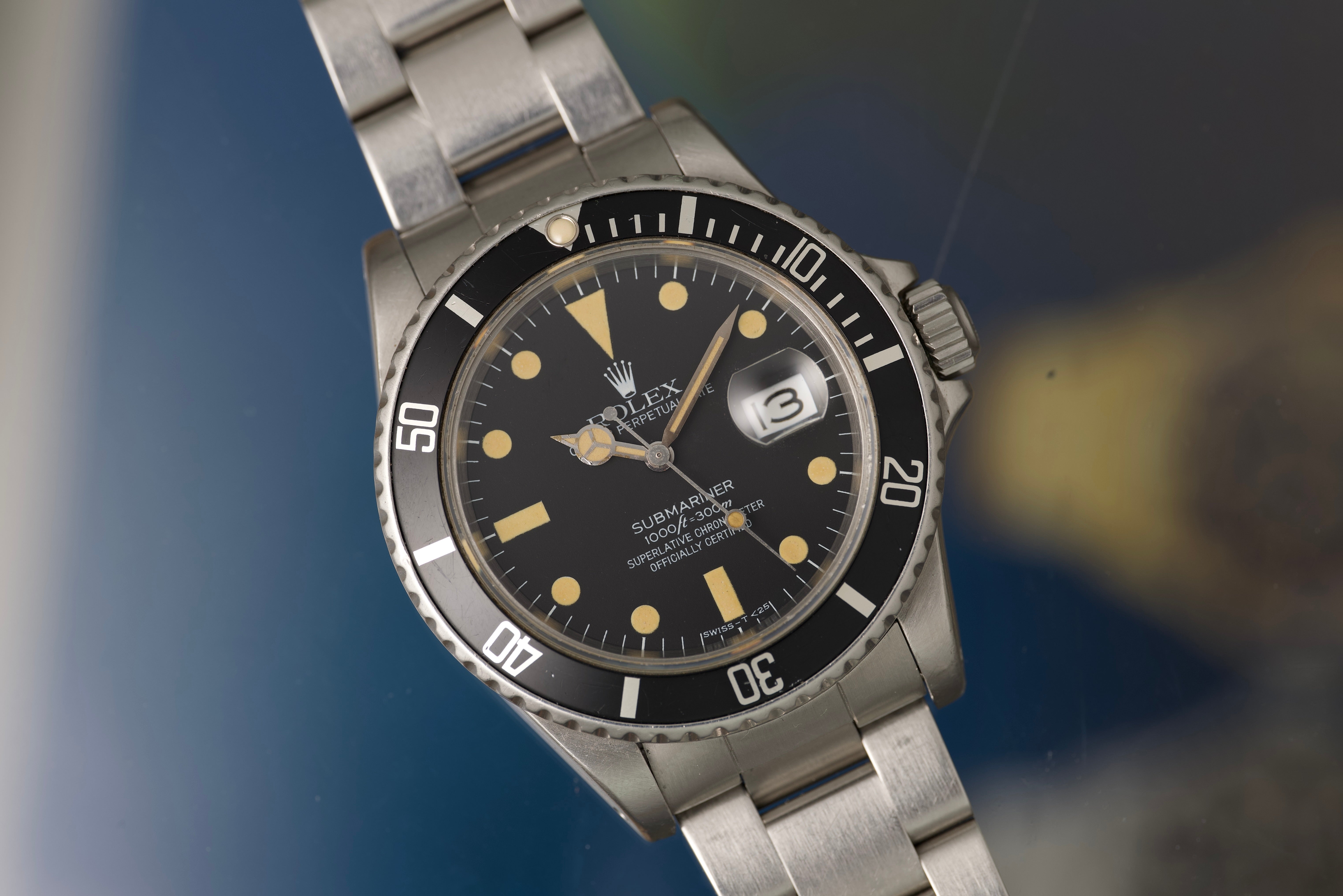 nicely preserved 16800 transitional submariner. The dial is excellent with vivid patina and the hands match nicely. The case is minimally polished if at all in the past and remains thick and even. The bezel is sharp and the insert is excellent. The bracelet is a 93150 with 593 endlinks and has very little stretch. The movement is running well and keeping perfect time. Comes with box, papers, both booklets, both hang tags and polishing cloth and anchor. A very nice collector set.