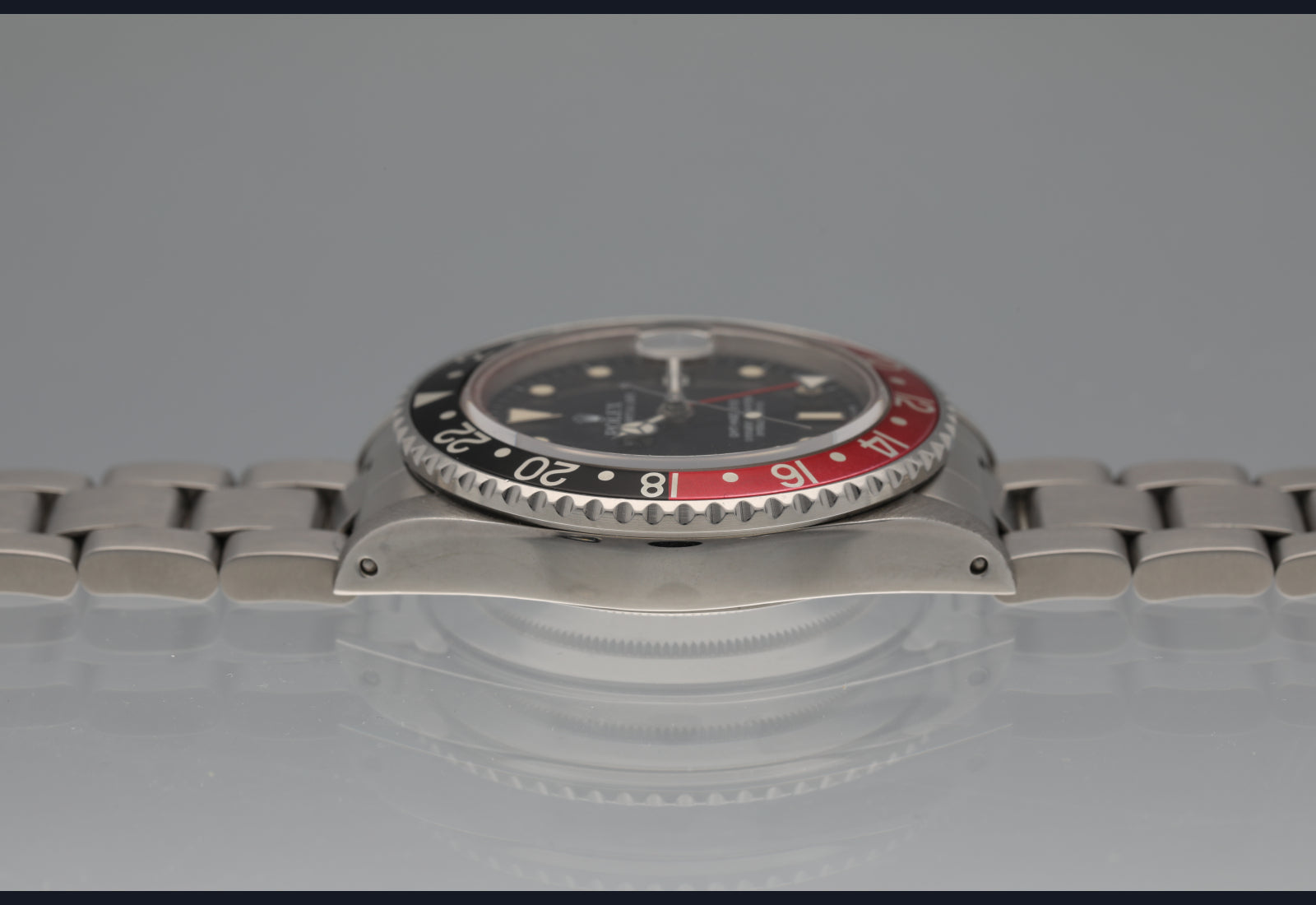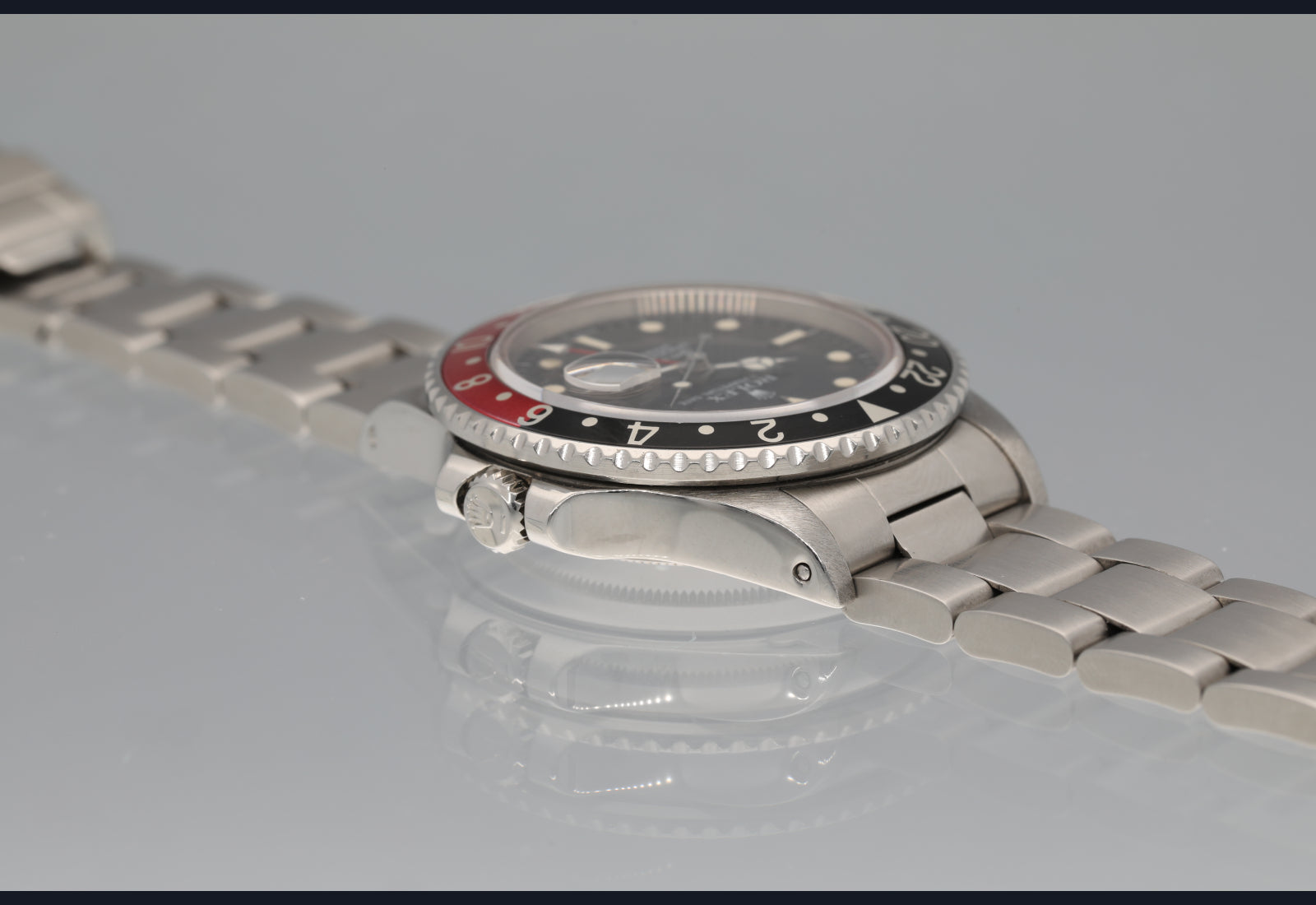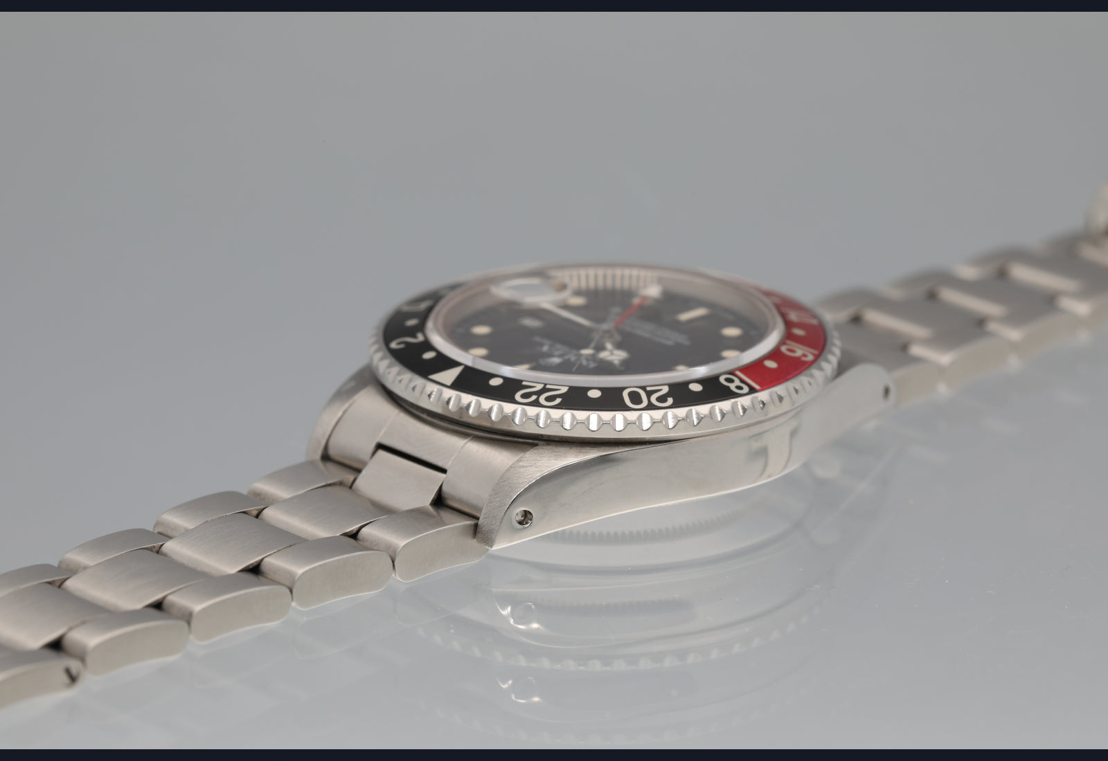 very nice fat lady 16760 GMT Master II from 1985. The dial and hands are perfect and creamy. The case was polished in the past. Bracelet is original and has 11 links. Bezel is sharp and insert is a nice red and black. The movement is running well and keeping excellent time. Complete with box papers hang tags and manuals