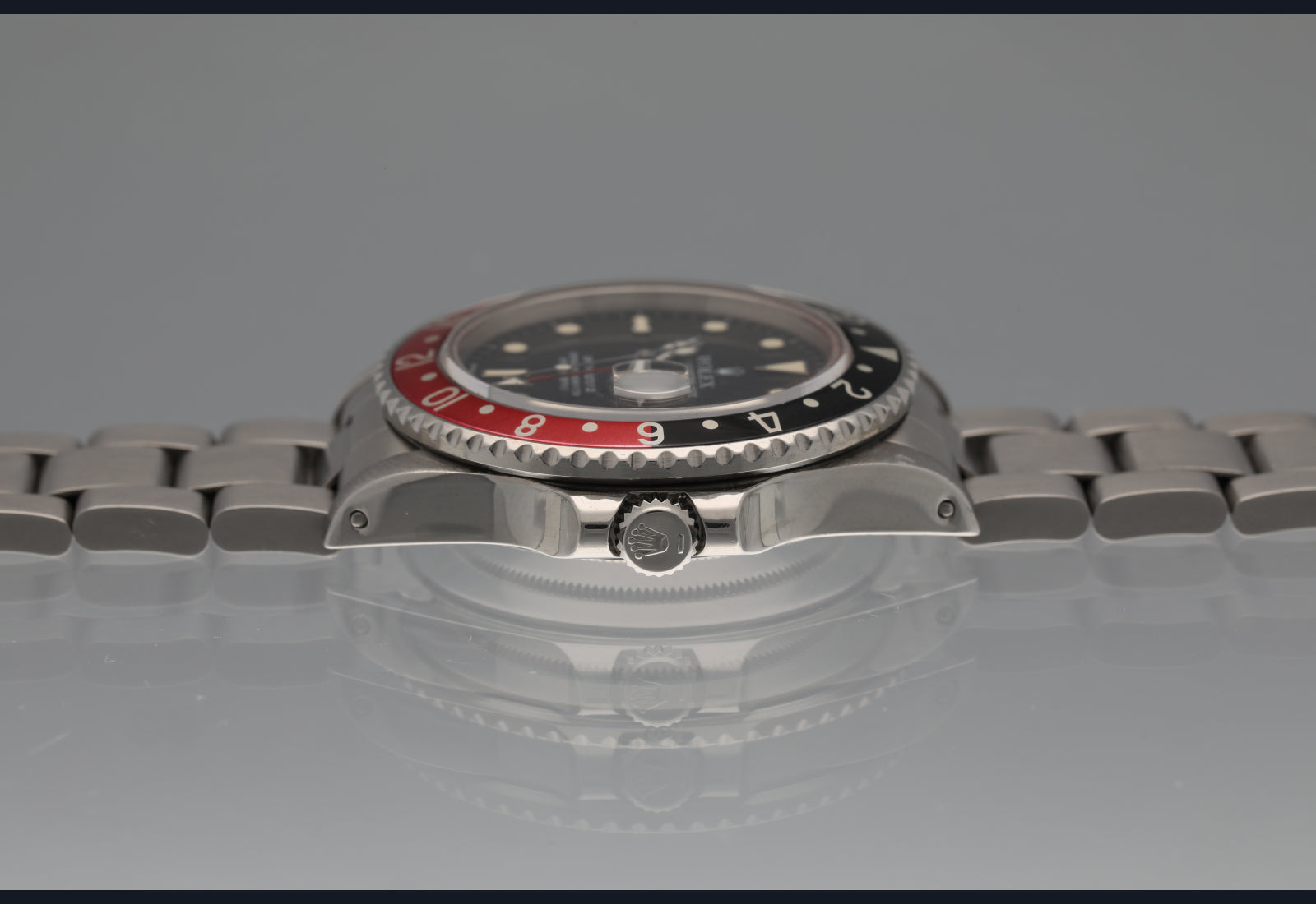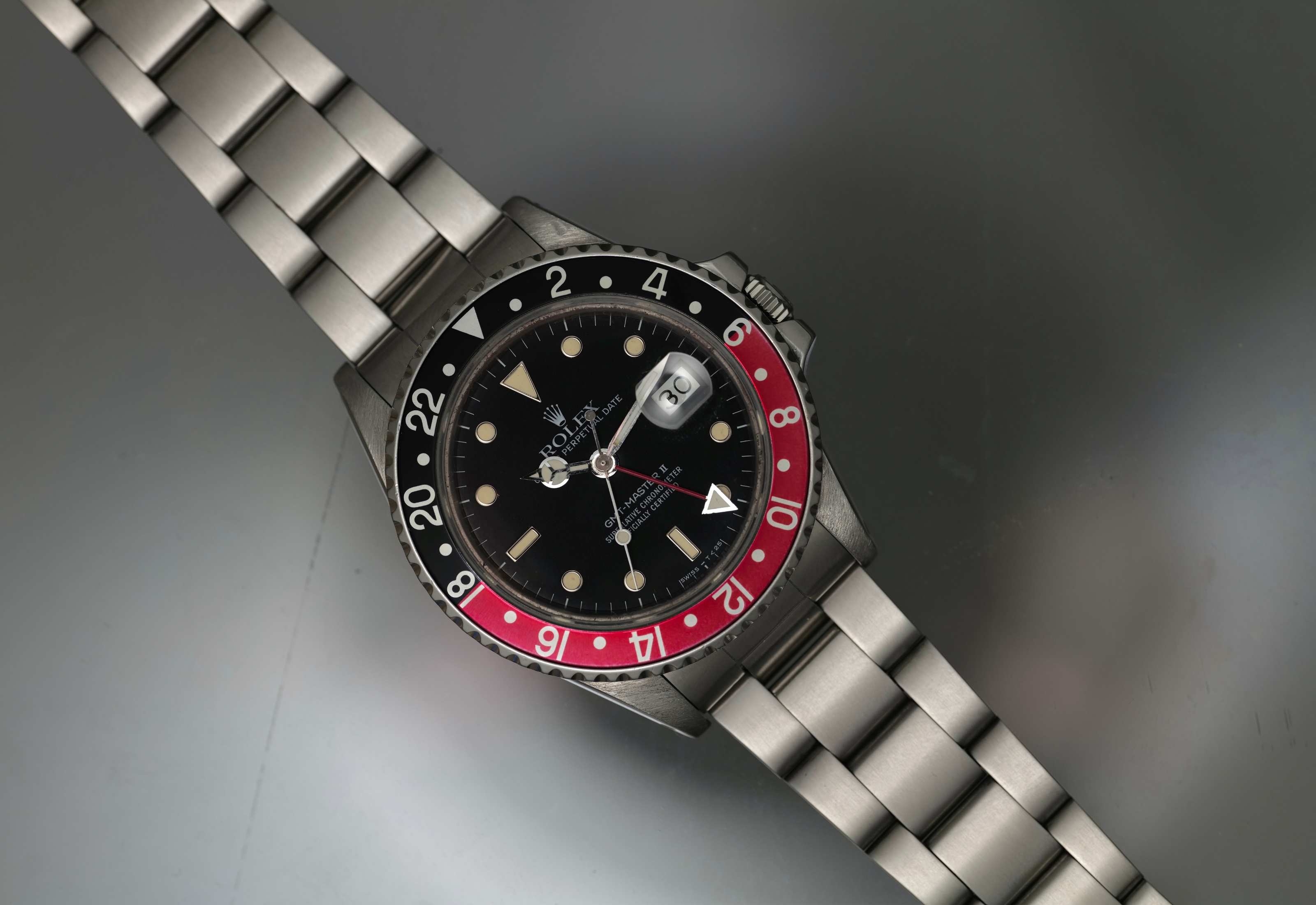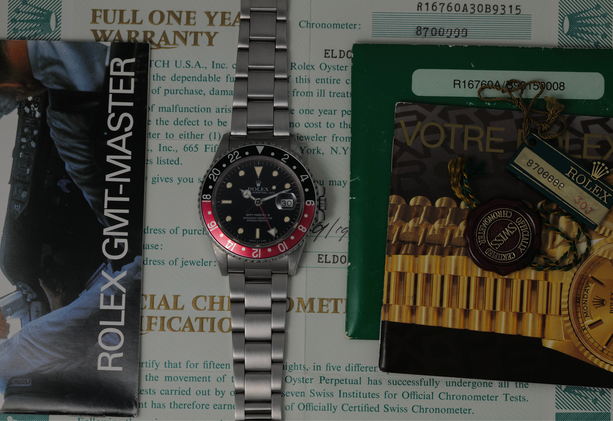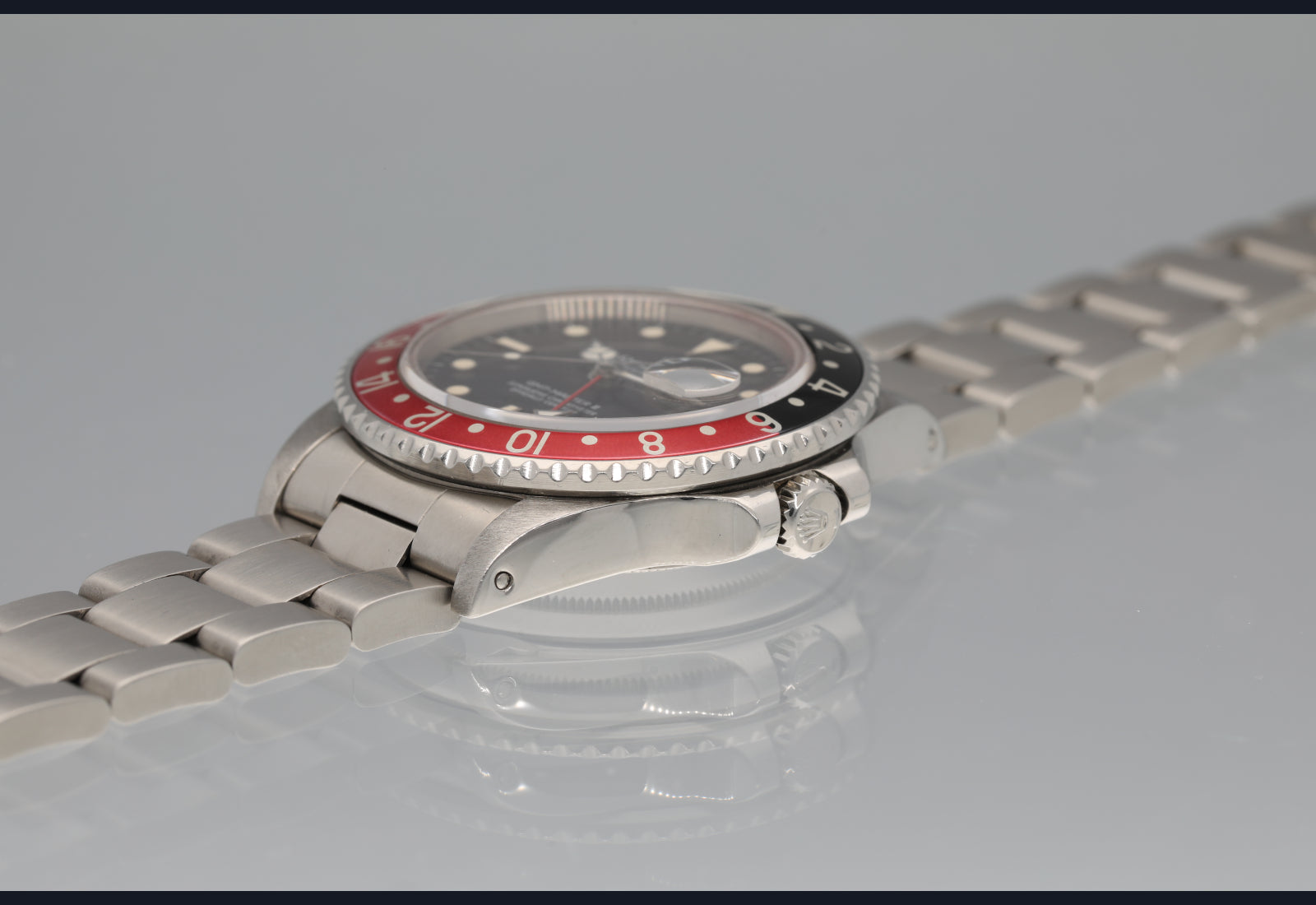 very nice fat lady 16760 GMT Master II from 1985. The dial and hands are perfect and creamy. The case was polished in the past. Bracelet is original and has 11 links. Bezel is sharp and insert is a nice red and black. The movement is running well and keeping excellent time. Complete with box papers hang tags and manuals