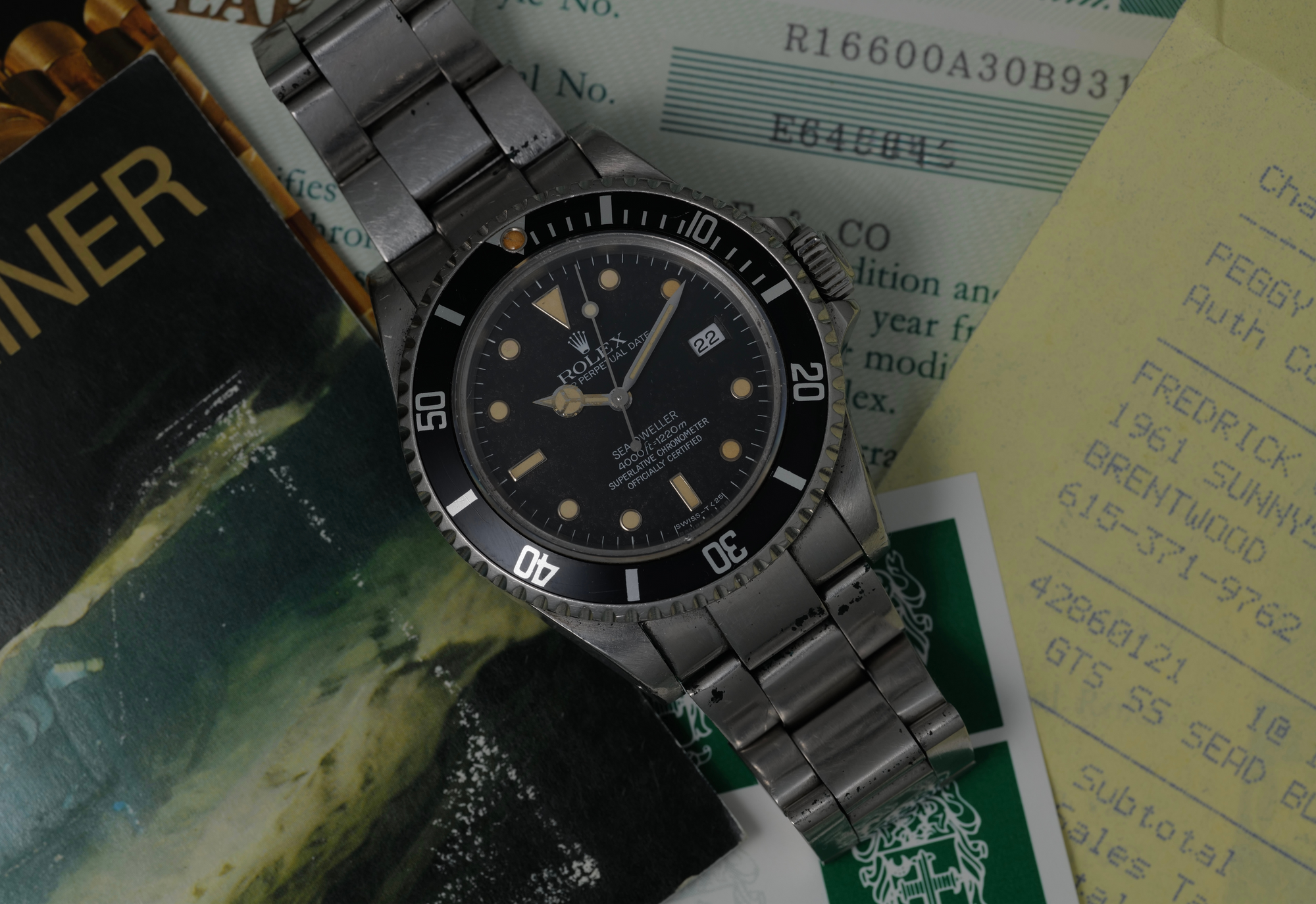 a very nice original 16600 coming from the original owner. The dial has turned a slight tropical brown and the hands match the lume on the markers. The case is a bit worn but unpolished. The bezel is sharp and the insert has uniquely fat fonts. The bracelet is original and does have some stretch to it and all of its links. I doubt this watch was ever opened or serviced however it is running pretty well and keeping good time. It will be professionally cleaned before delivery. Comes with box, manuals, papers, original purchase receipt and also hang tags.