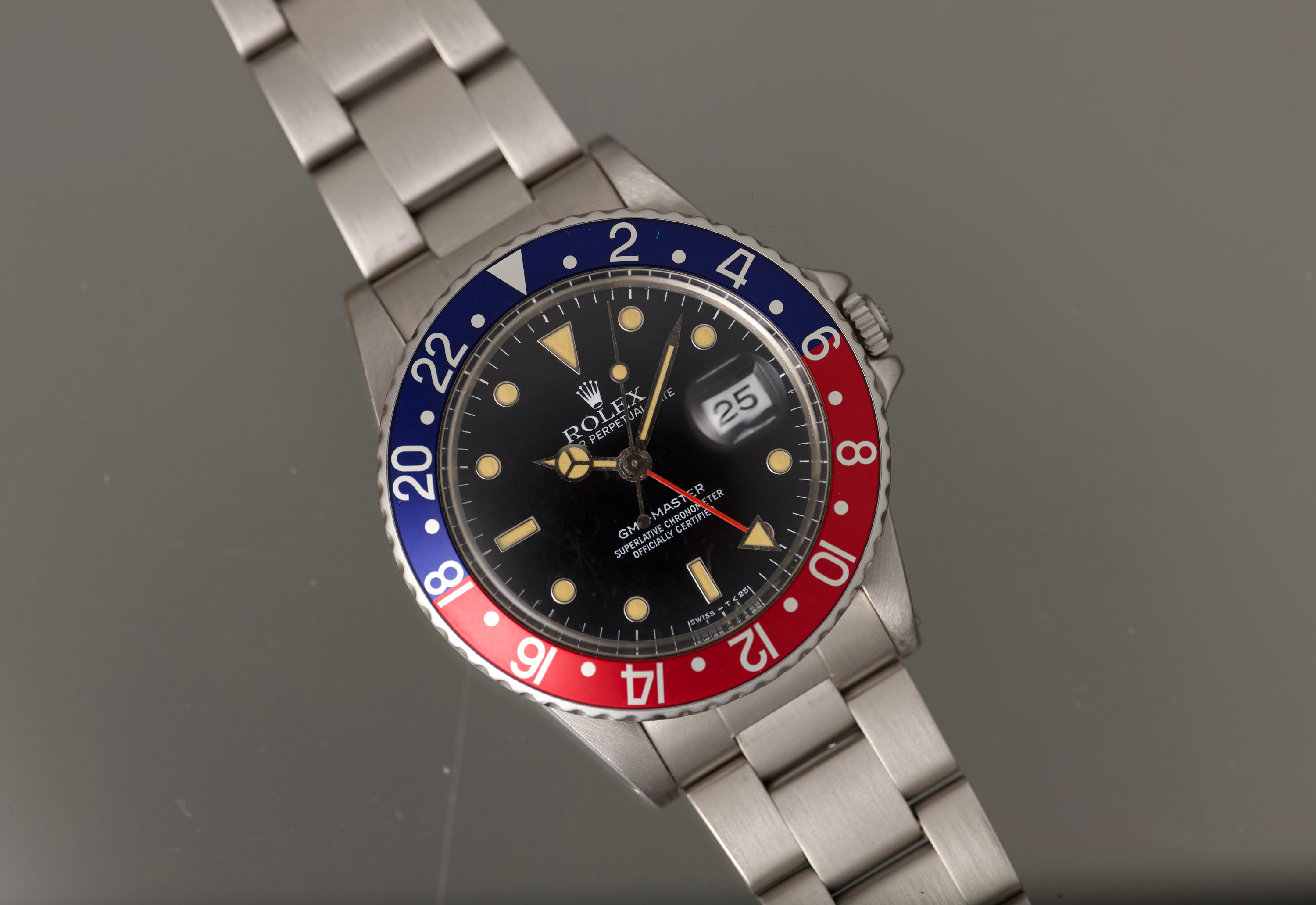 nicely preserved 16750 from 1984. The dial and hands are perfect and have vivid patina. The case was previously polished however remains thick and even. The bezel is sharp and the Pepsi insert looks almost like new. The bracelet is tight and has 11 links. The movement is running strong and keeping excellent time however last service is unknown - comes with box and paper