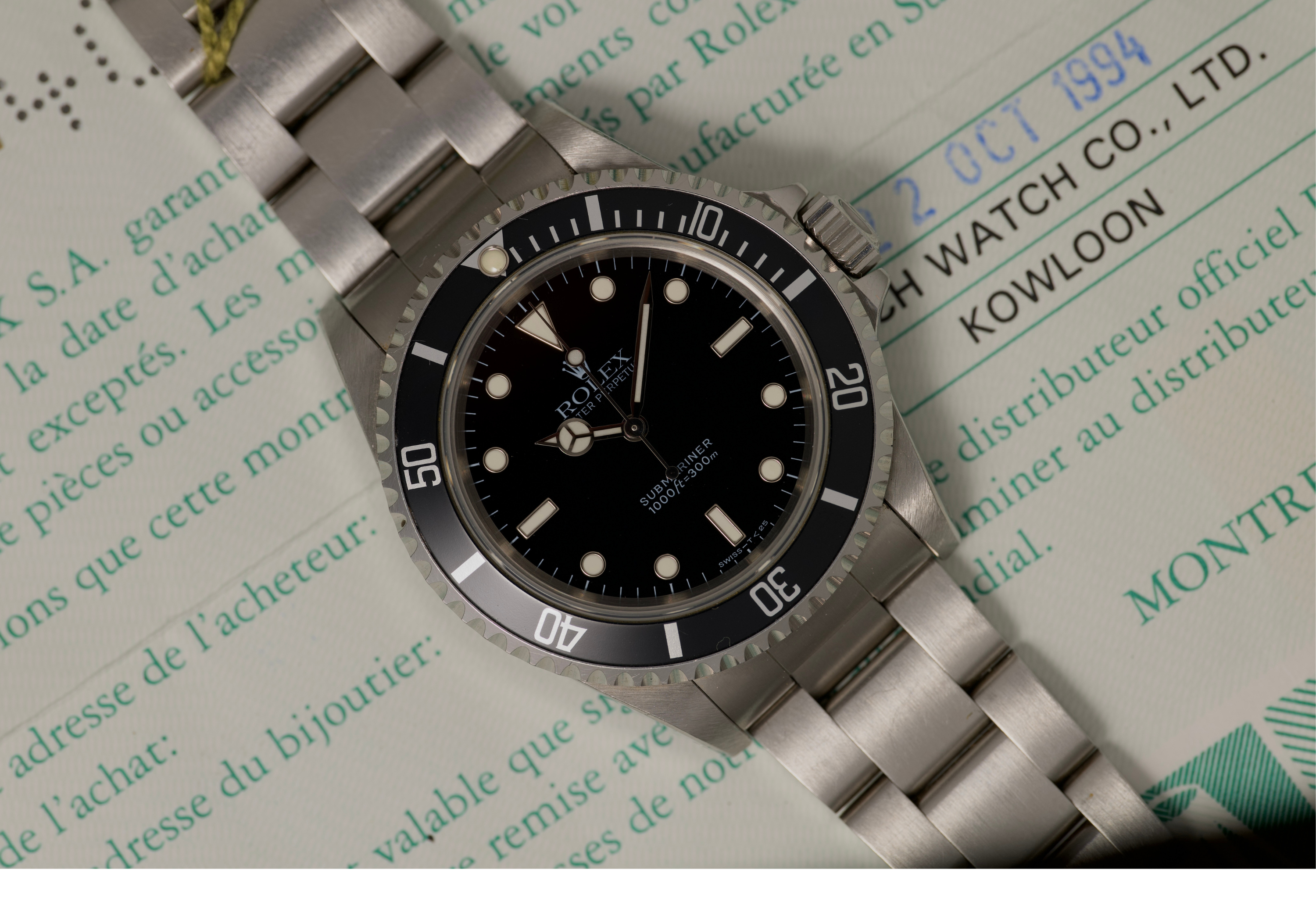 Super nice non date sapphire crystal submariner from 1993. The dial and hands have light cream lume and are perfect. The case is sharp and unpolished with caseback sticker still in tact. The bezel is sharp and the insert is excellent. The bracelet is fully linked with no stretch. The movement is running as it should. Comes with box papers, serilized hang tag and both manuals. a nice collector set.