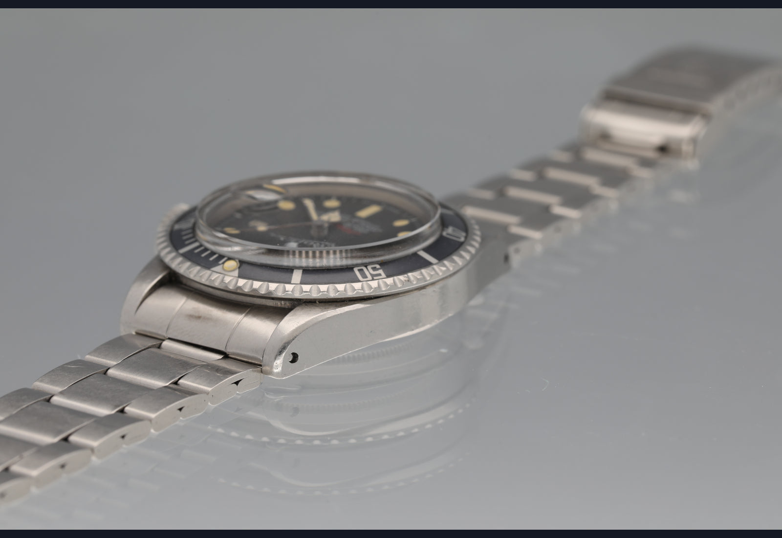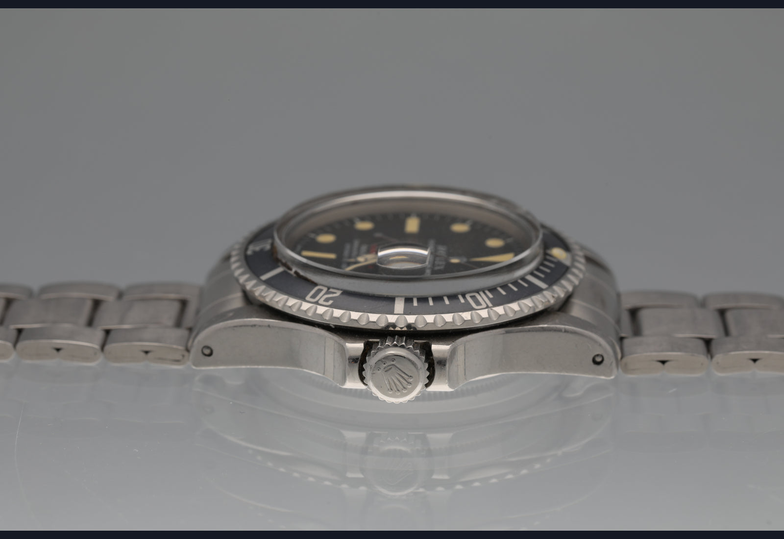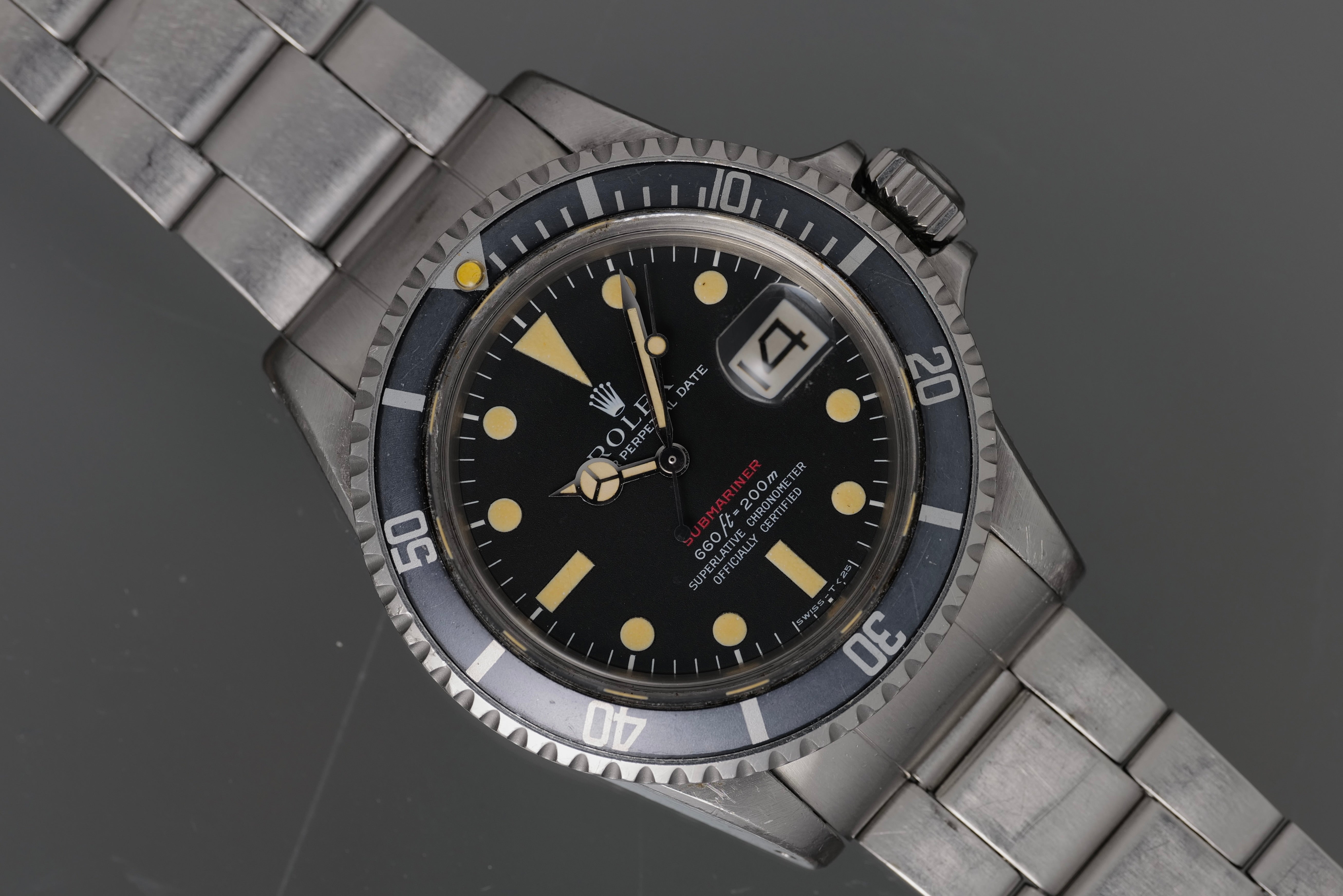 Simply super RED Sub from 1972. The dial and hands are flawless with nice patina. The case is worn well but unpolished and all numbers clear. The bezel is sharp and the insert is uniformly faded to a very cool grey blue. The bracelet is the original 9315/380 with full links plus diver extension and has some moderate stretch commensurate with age. Comes with box and oyster manual. Movement is running strong and keeping excellent time. Last service unknown.