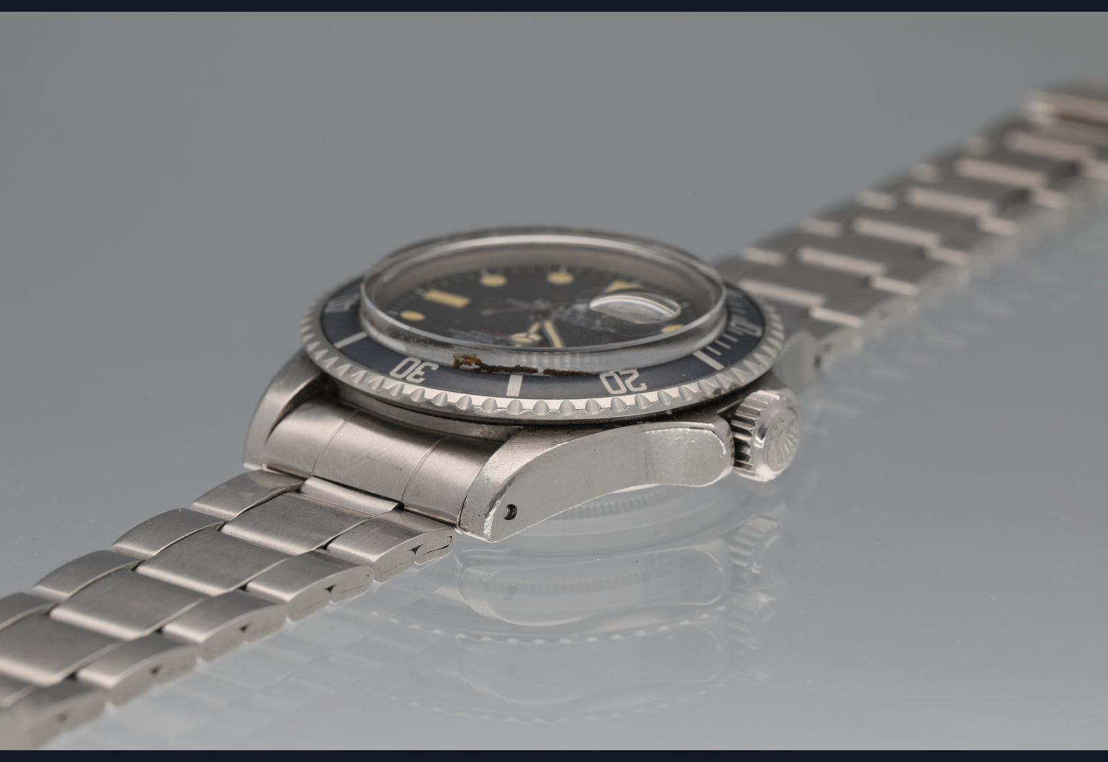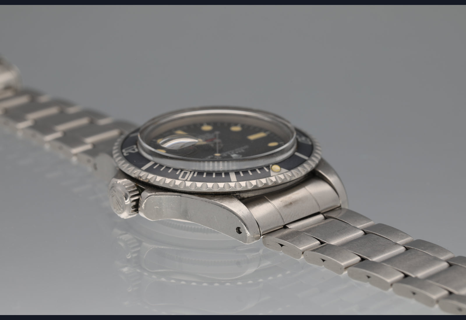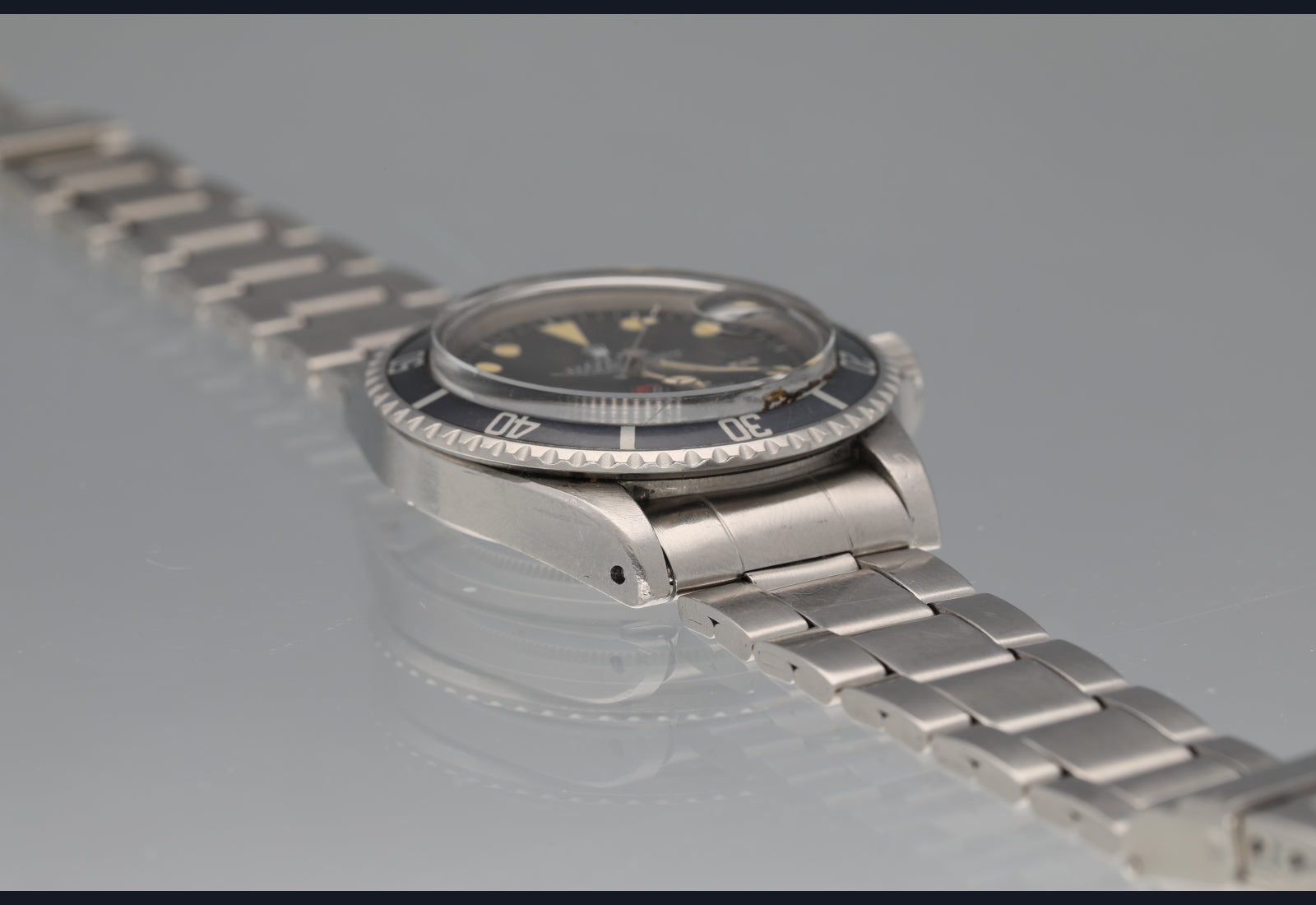 Simply super RED Sub from 1972. The dial and hands are flawless with nice patina. The case is worn well but unpolished and all numbers clear. The bezel is sharp and the insert is uniformly faded to a very cool grey blue. The bracelet is the original 9315/380 with full links plus diver extension and has some moderate stretch commensurate with age. Comes with box and oyster manual. Movement is running strong and keeping excellent time. Last service unknown.