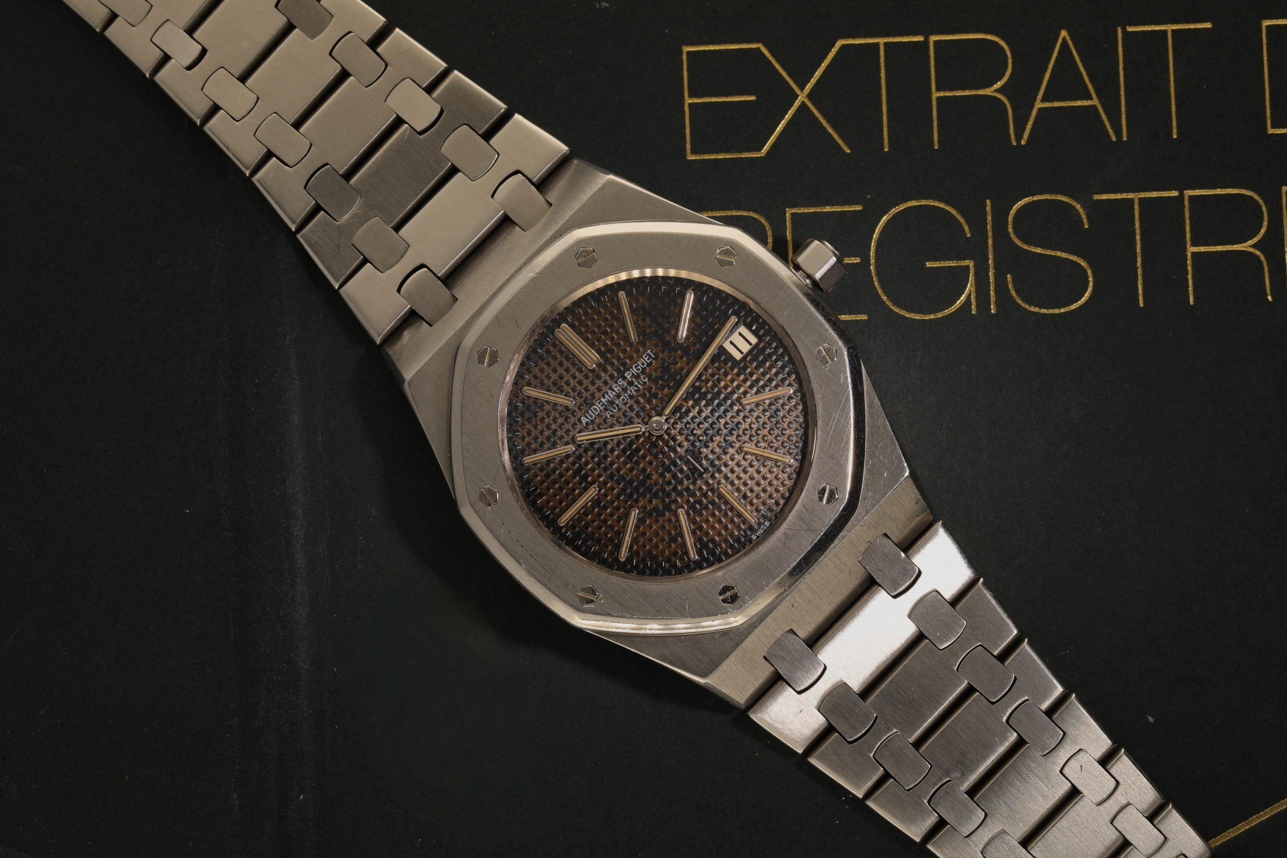 One of the nicest Tropical vintage Royal Oaks out there - A true vintage watch collectors dream. This AP 5402 Jumbo is very well preserved. The reference 5402 is the original Royal Oak, released in 1972, the first 200 examples ( A SERIAL) have become highly collectable, This example features an outstanding SUPER tropical Tapisserie dial in excellent condition with no blemishes and the hands match nicely. The case appears to be in unpolished condition and the original bracelet has all of its links. The watch is accompanied by its original box and extract from the archives dated from 2019. The movement was serviced about a year ago and is running perfectly.