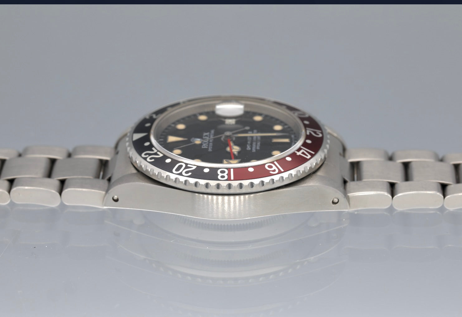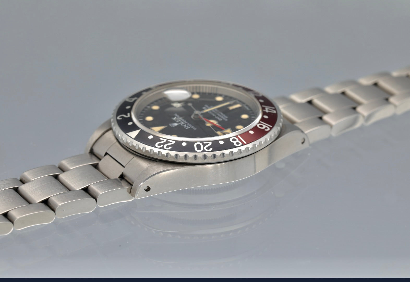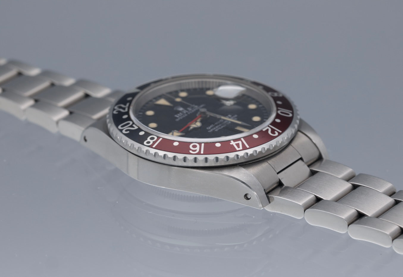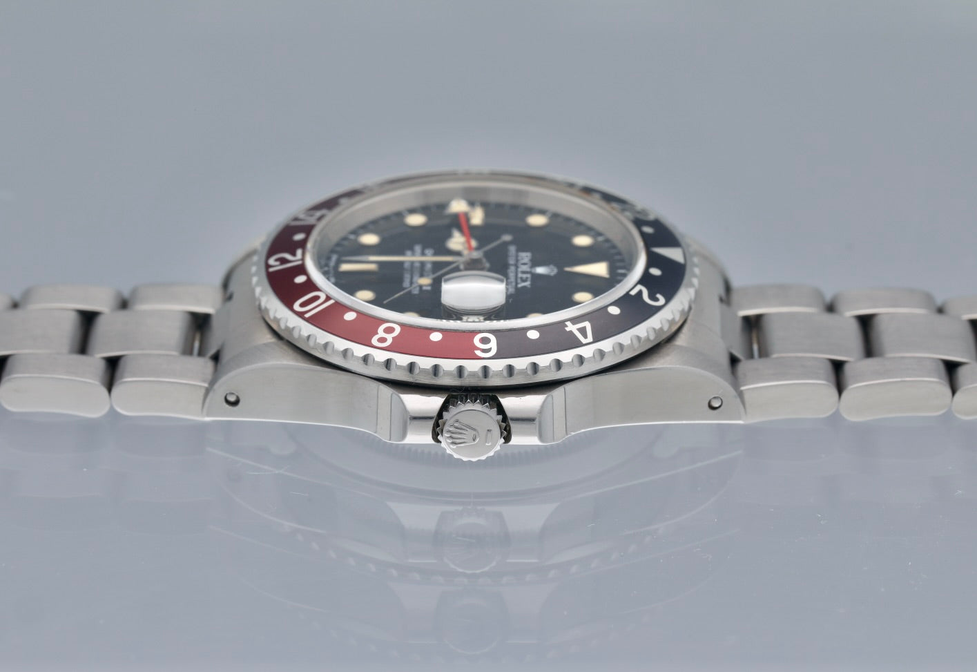 First series 16760 aka Fat Lady GMT Master II. The "no date" dial and hands are perfect with vivid patina. The super sharp unpolished case is sparingly worn with all original bevels in tact and crisp numbers. The bezel is like new and the original red back insert has faded to a raspberry and charcoal grey color - just fantastic. The bracelet is original with no stretch and all links. The movement is running perfectly. Comes with original box only.