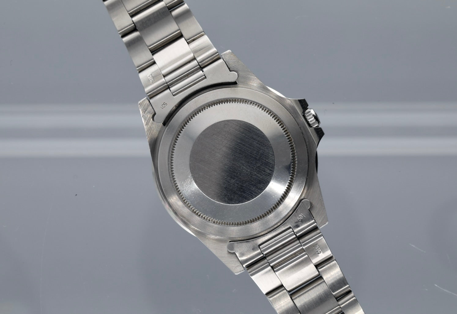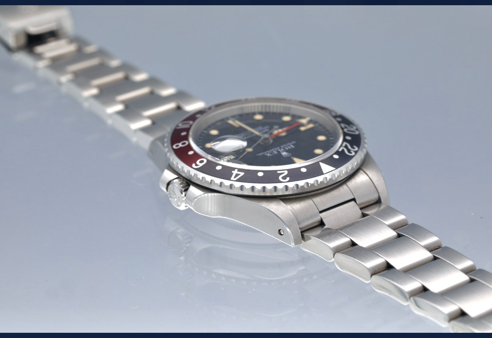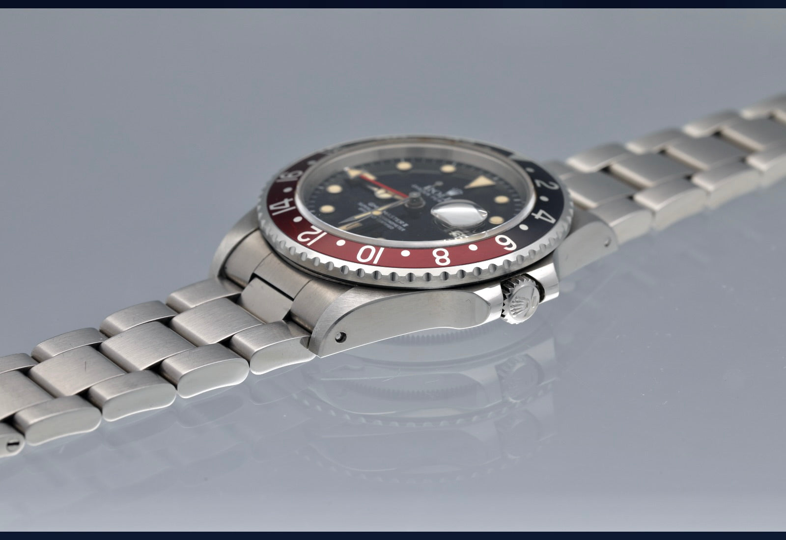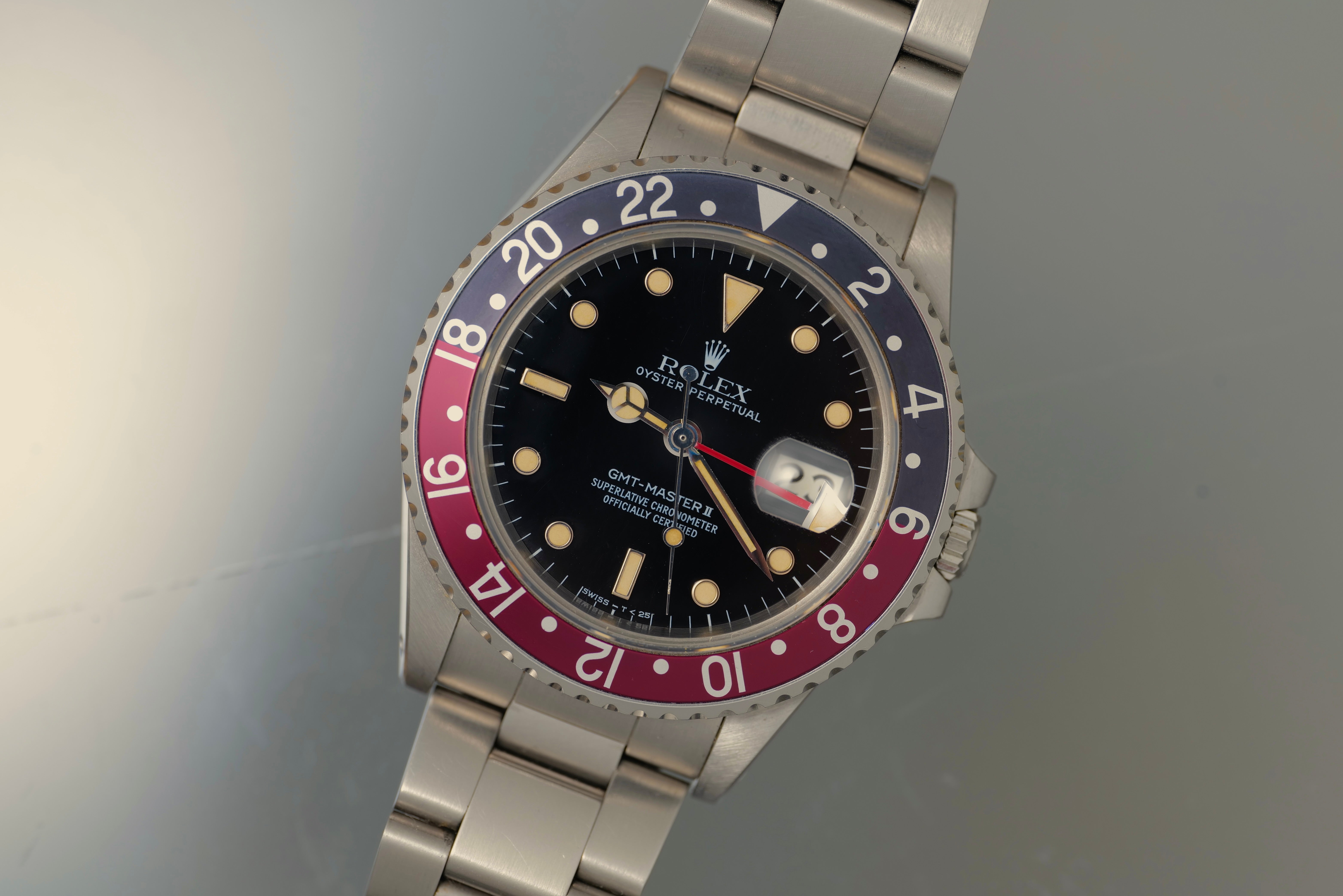 First series 16760 aka Fat Lady GMT Master II. The "no date" dial and hands are perfect with vivid patina. The super sharp unpolished case is sparingly worn with all original bevels in tact and crisp numbers. The bezel is like new and the original red back insert has faded to a raspberry and charcoal grey color - just fantastic. The bracelet is original with no stretch and all links. The movement is running perfectly. Comes with original box only.