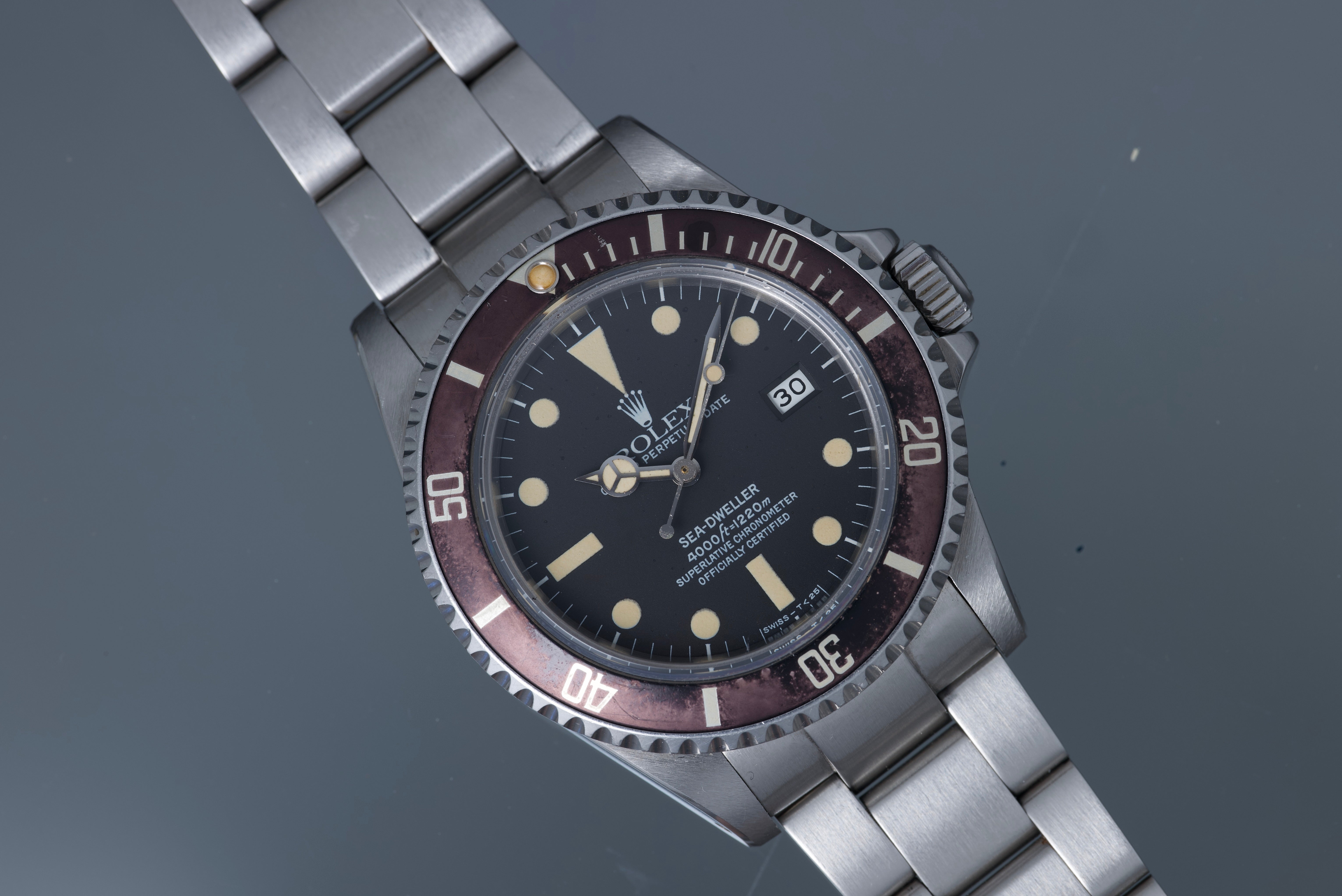A well preserved 80s Sea Dweller ref 16660. The dial and hands have a very nice patina and have a slight tropical effect. The case was lightly polished in the past and remains thick and even with wide bevels. The bezel is sharp and the insert has faded to a deep brown. The bracelet is original and tight with very little stretch. The movement was serviced in the last 6 months. Comes with both boxes, both manuals, punch guaranty and one hang tag / anchor.