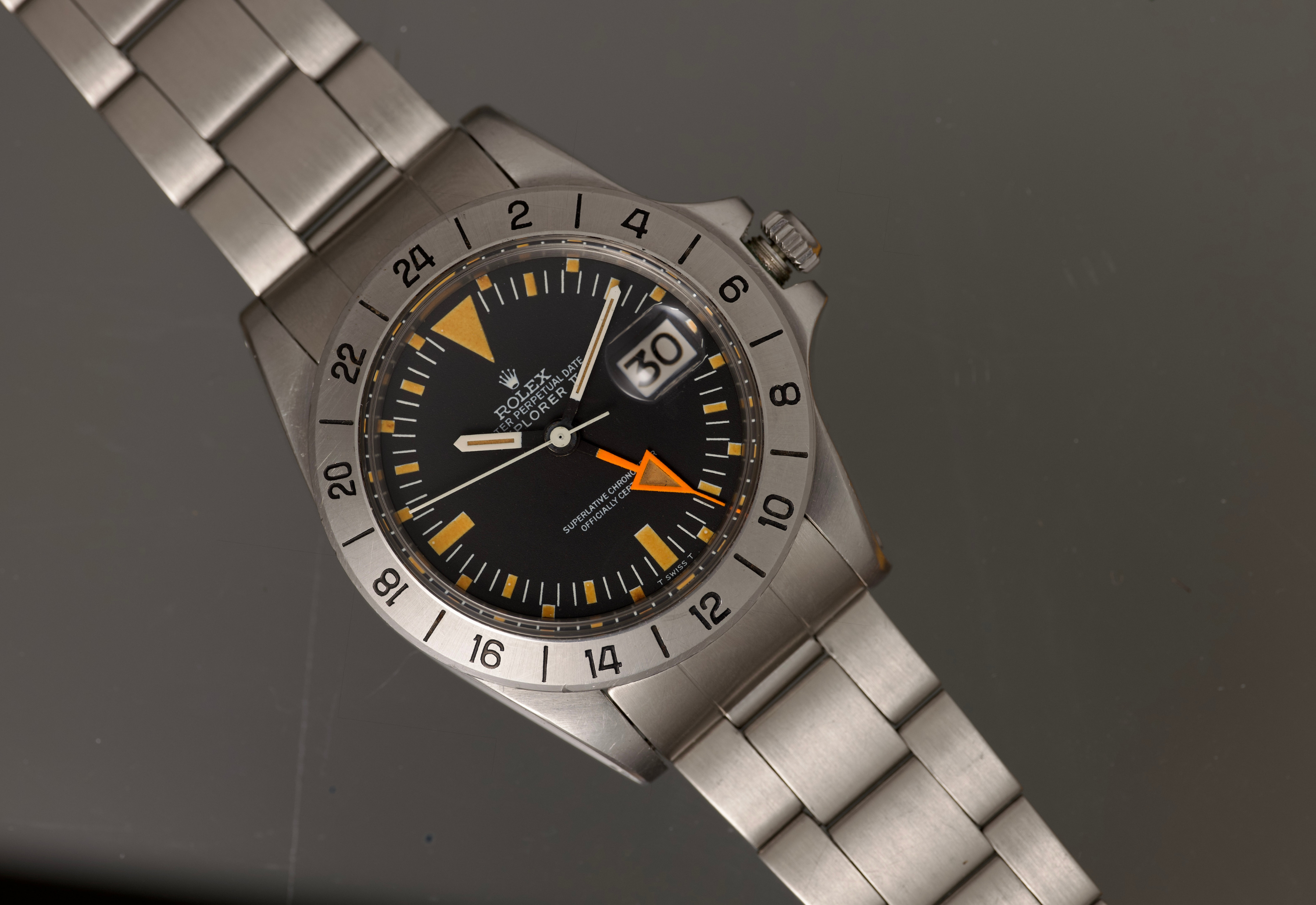 ok so here it is down and dirty. Totally original 1655 Explorer straight hand as found. The MK1 dial and hands have over the top incredible patina and are perfect shape under that old scraped up crystal.. The bezel is sharp and not missing any paint. The Case is unpolished showing the original bevels and clean numbers with no pitting or corrosion. The bracelet is the original USA rivet band with all of its links with moderate stretch. The movement was found running but not well. The watch is currently being cleaned and serviced and a new crystal and gaskets are being installed as well. Will be delivered in pristine condition. Comes complete with Box, original Punch guarantee, oyster manual and old explorer advertising materials. A real collectors dream.