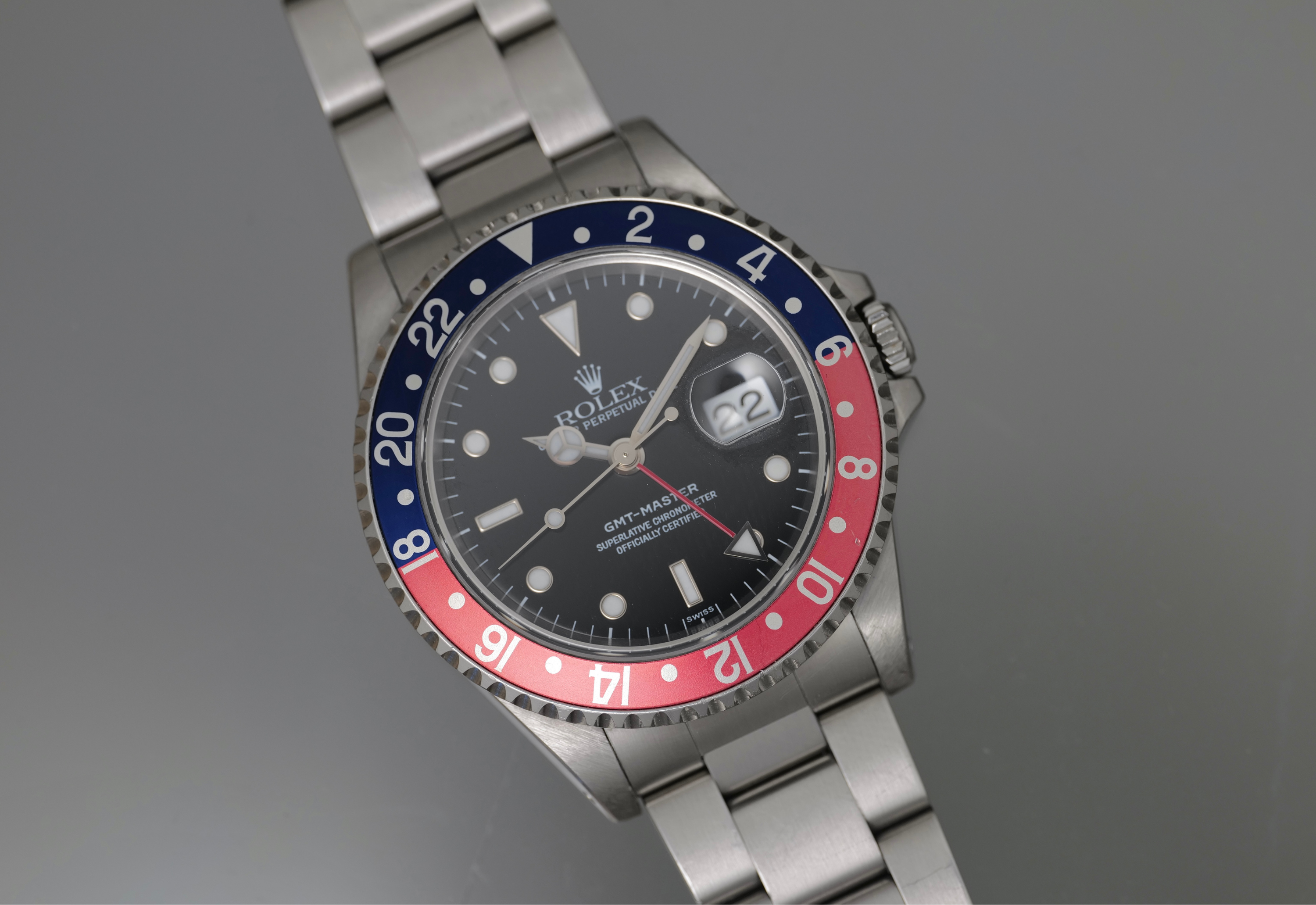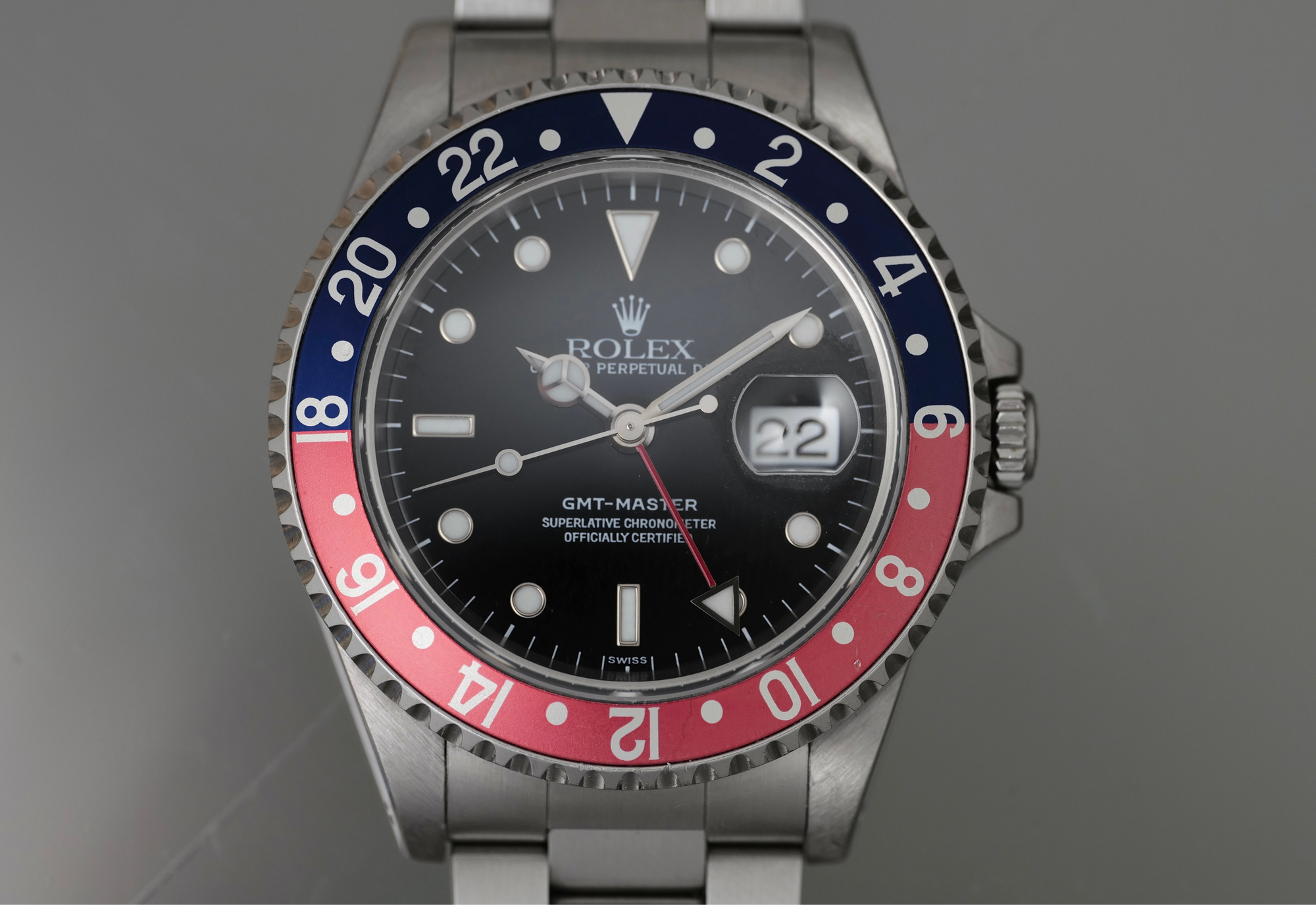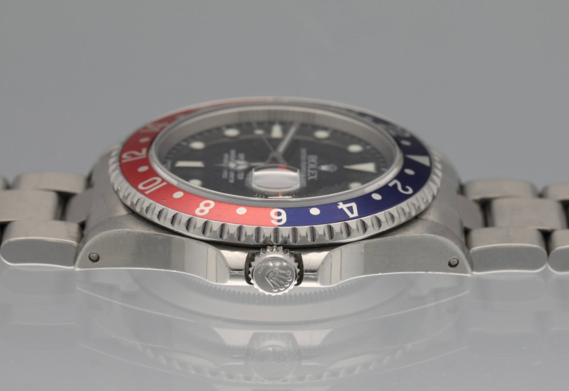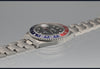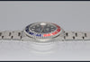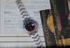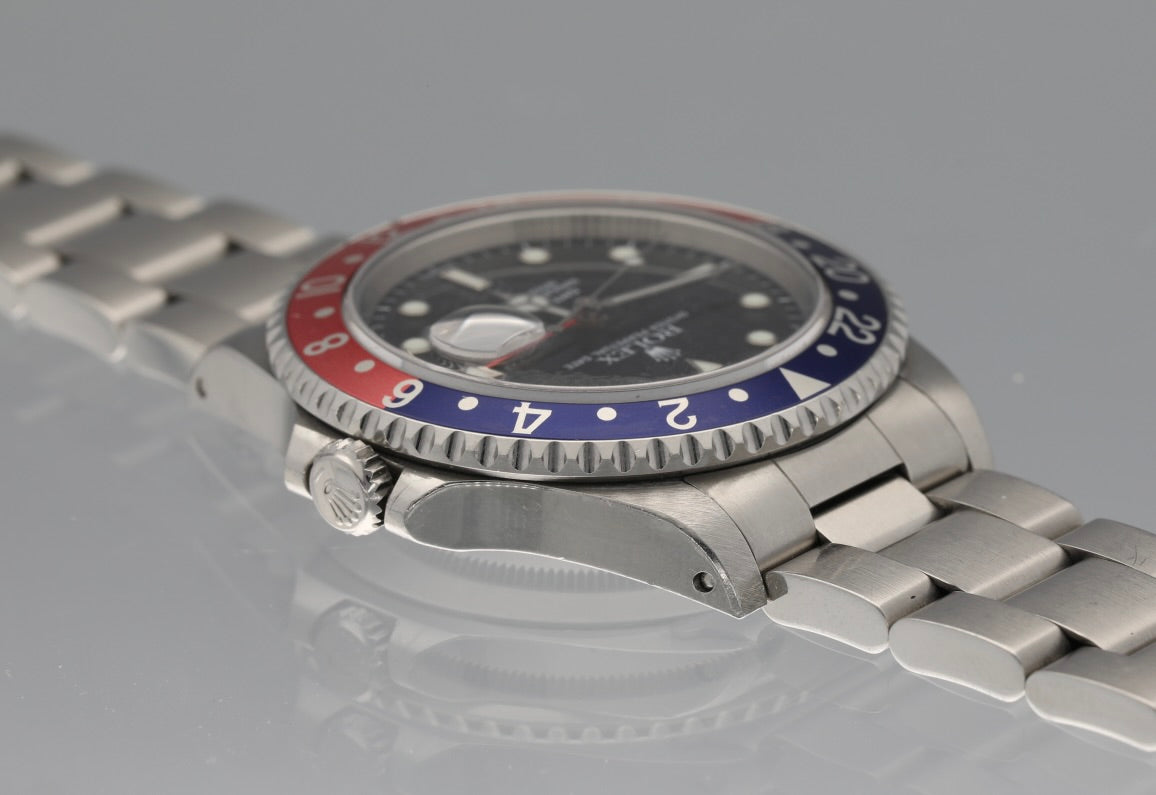 A Sweet Pepsi 16700 from 1998 where the insert has faded to a pink and royal blue. The dial and hands are perfect Case is sharp and unpolished and the right lug has a small ding as pictured. Serial and reference numbers sharp between the lugs. The bezel is sharp and the insert is excellent. The bracelet is original and tight with 11 links. The movement is running as it should and was serviced last eeek. comers with box papers and manuals.