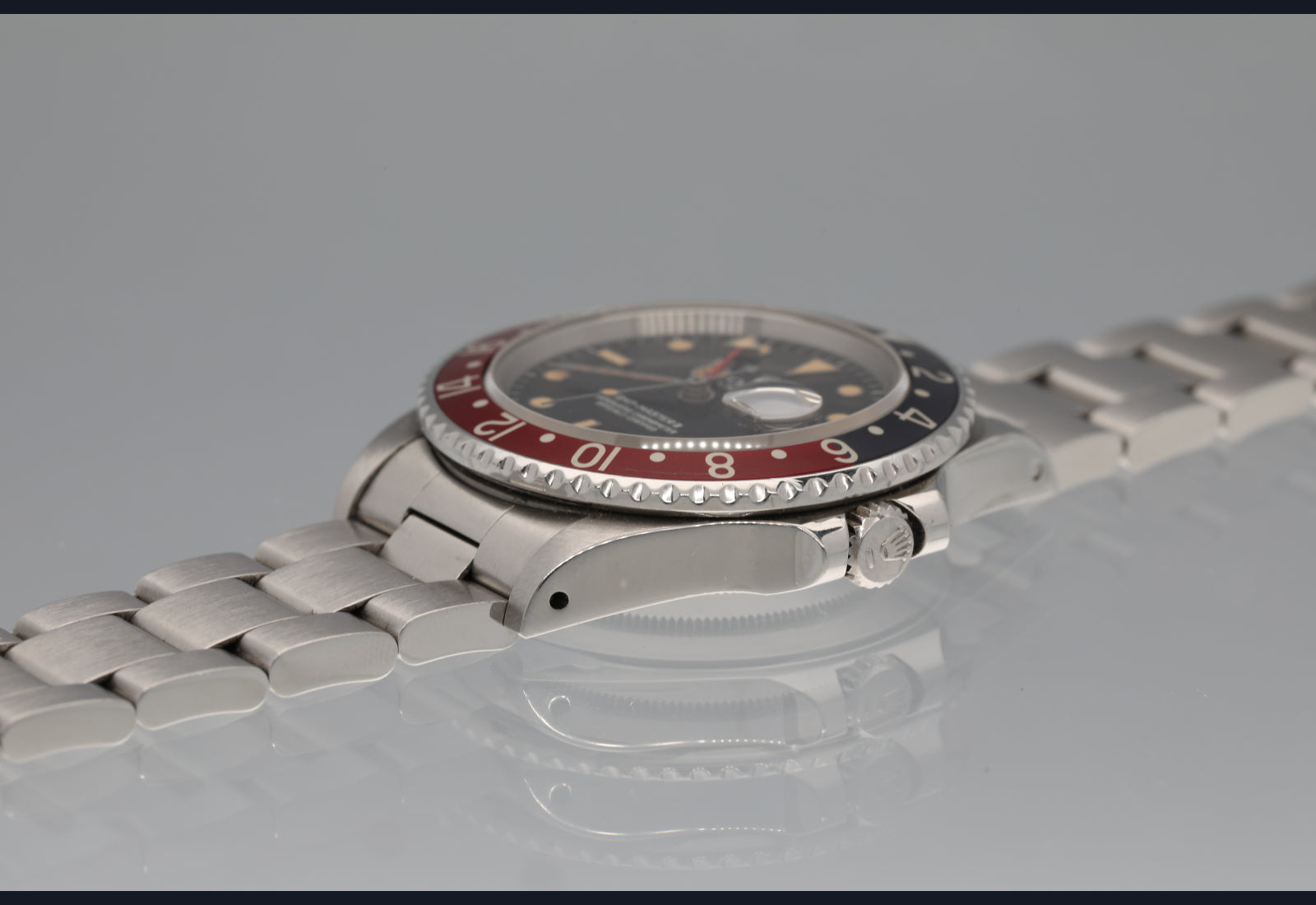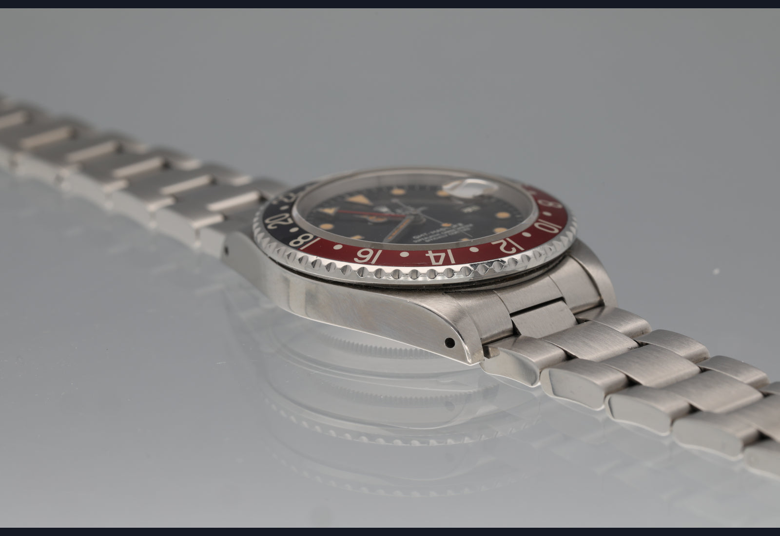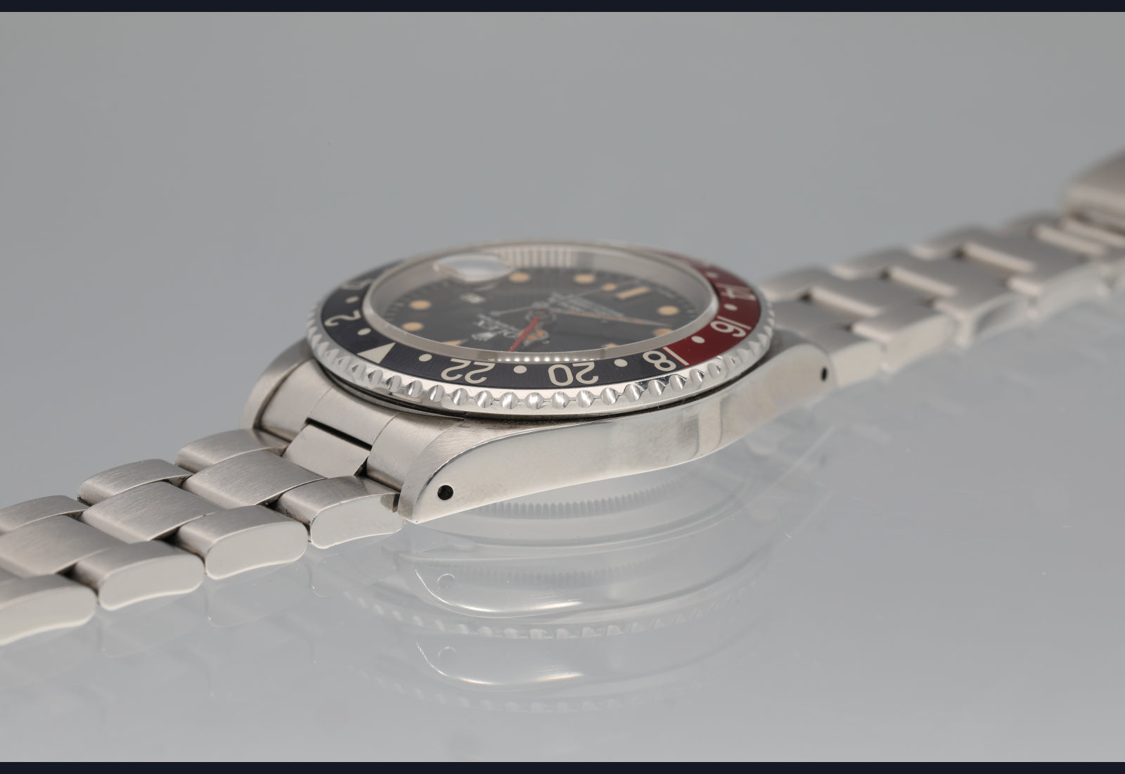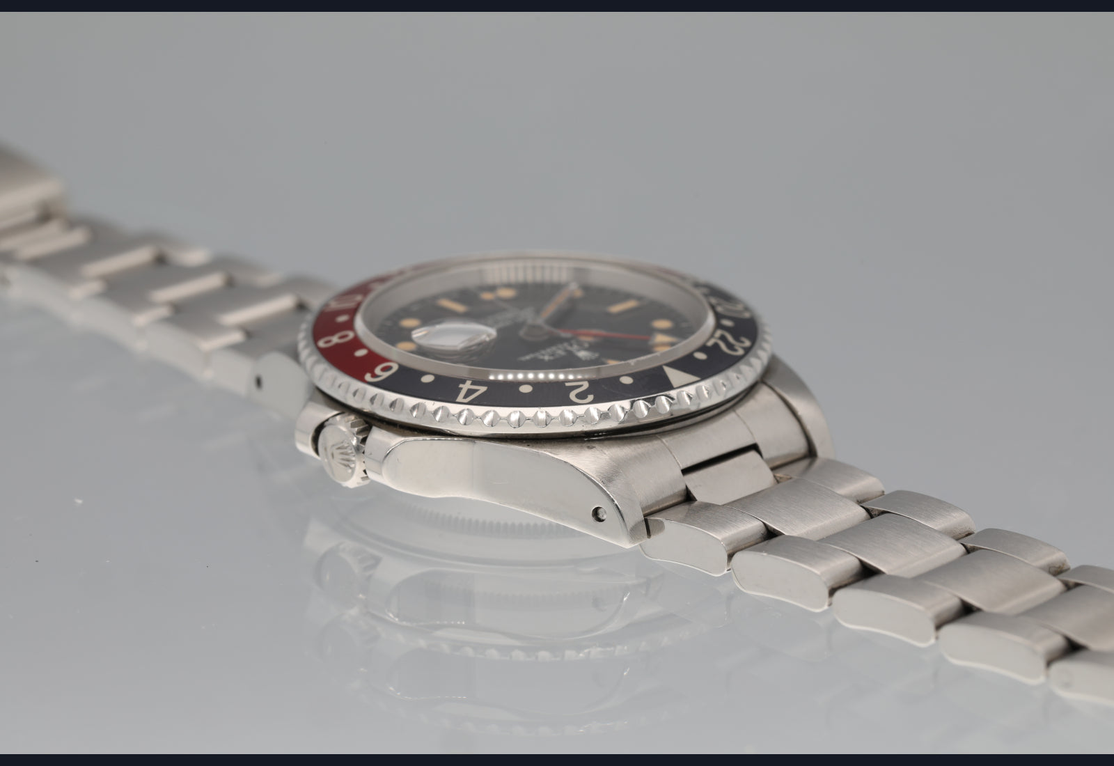 Well preserved 16760 first series from 1984. The dial and hands are perfect and the surface of the dial has turned totally tropical very evenly. The case is thick and has been lightly polished in the past. The bezel is sharp and the insert is the original red back that was only available on the very first iterations of the 16760 and it has faded to a grayish hue where it once was black. The bracelet is original, tight and fully linked. The movement is running perfectly and was serviced in the last 6 months. no box or papers