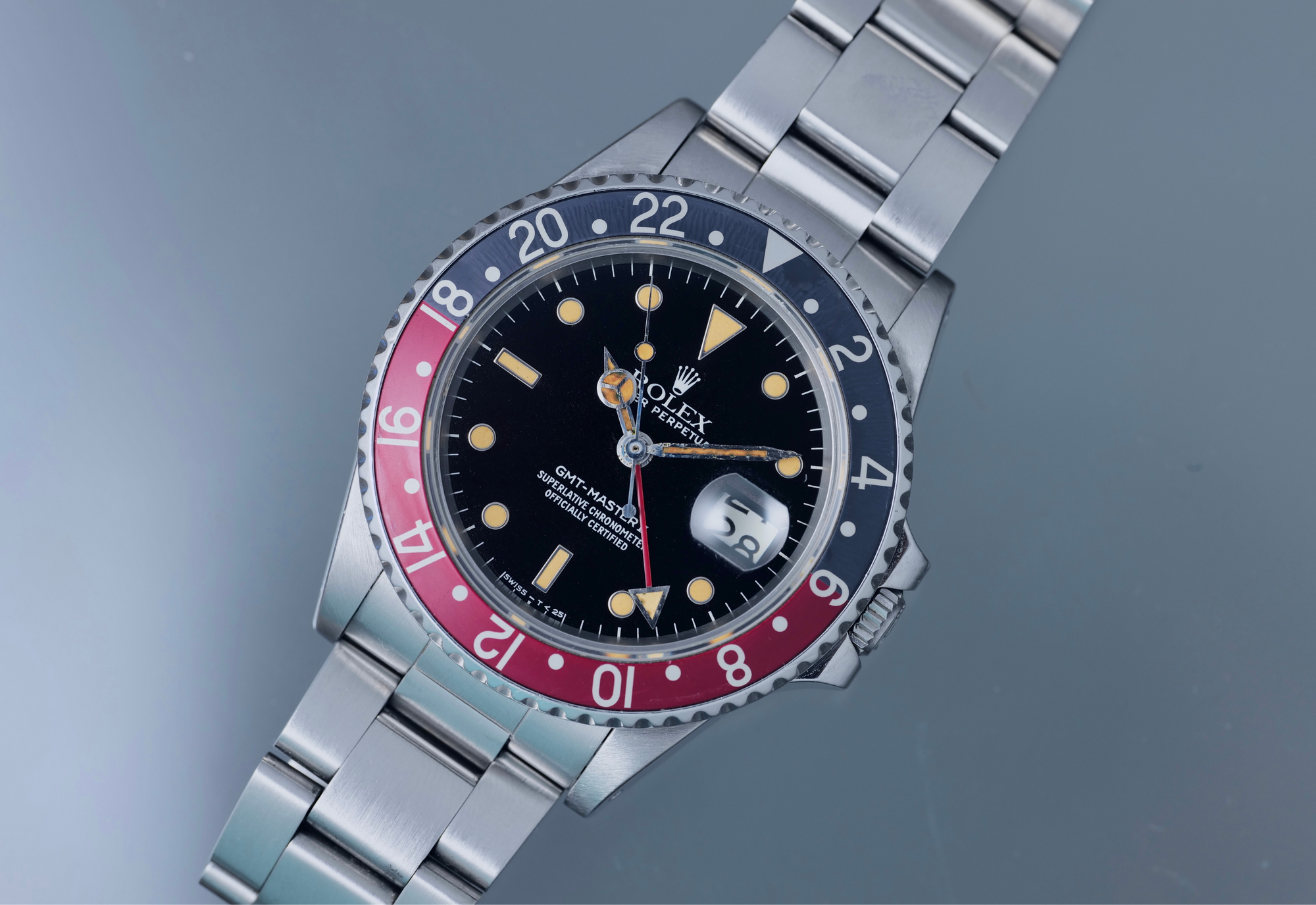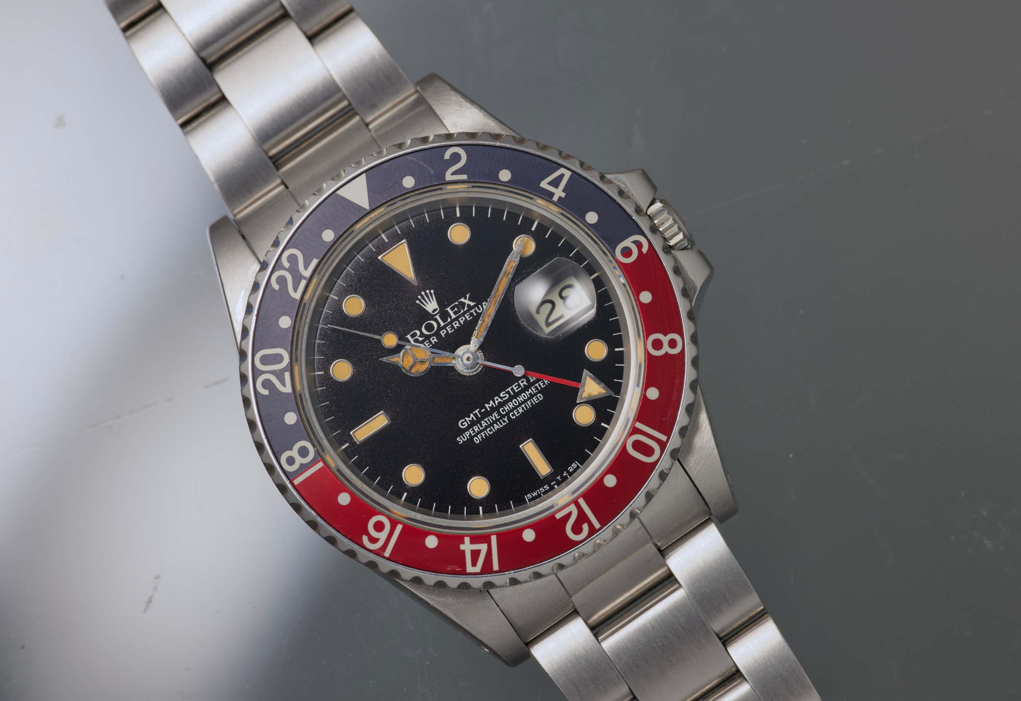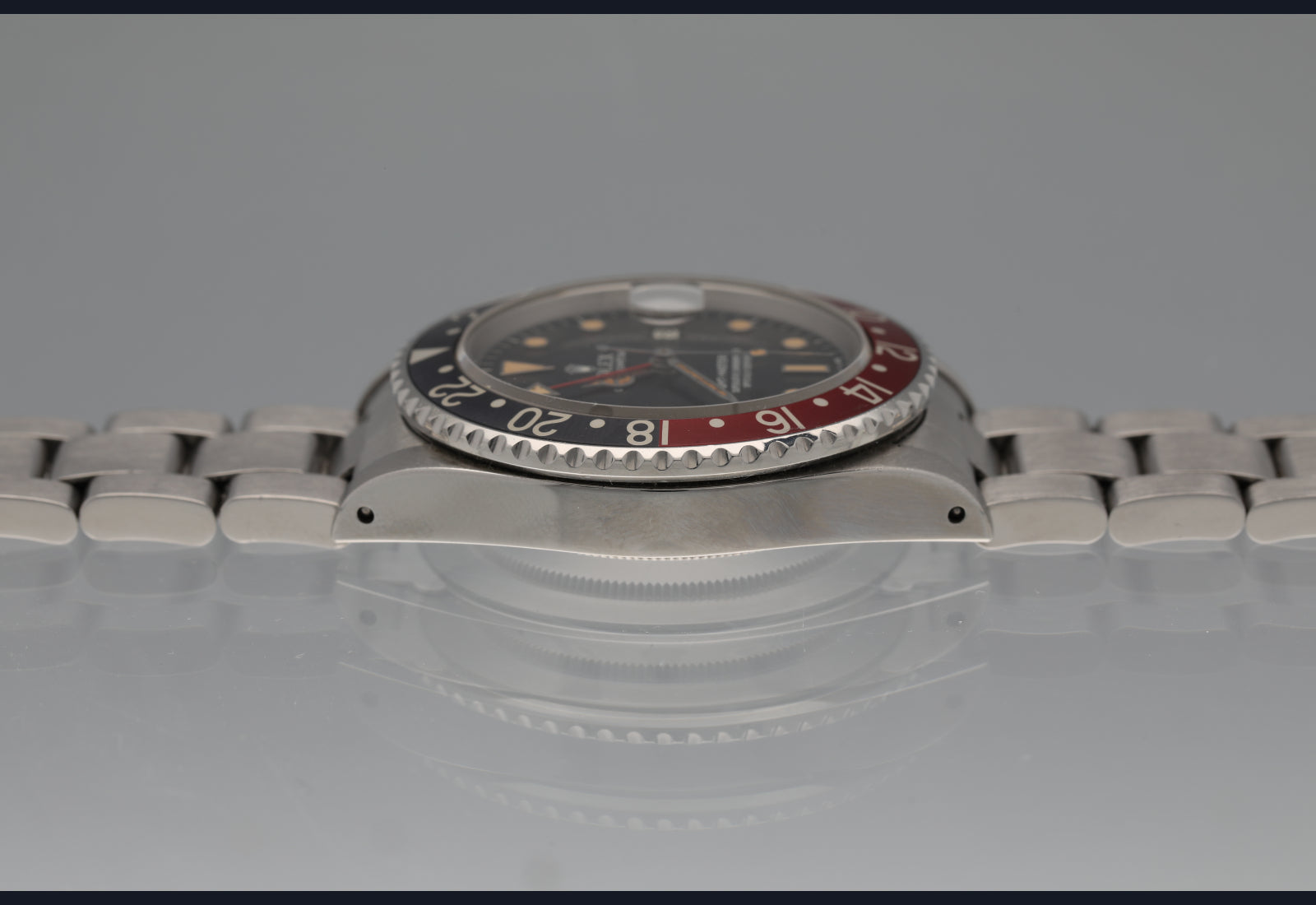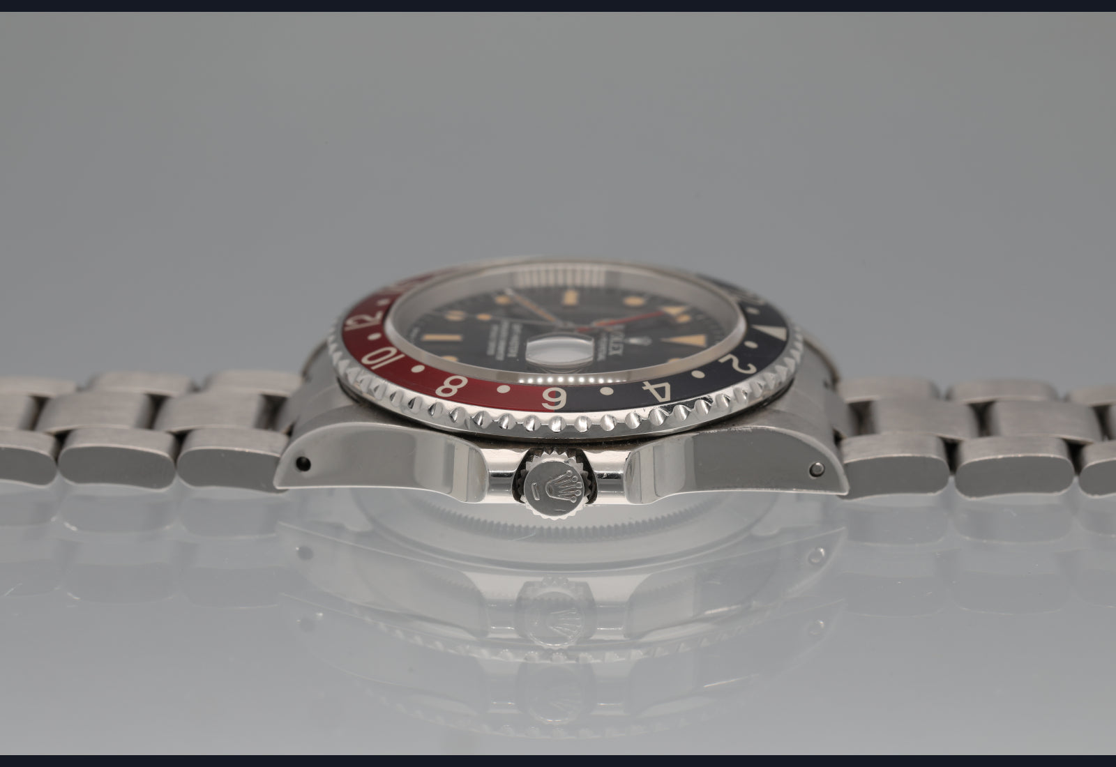Well preserved 16760 first series from 1984. The dial and hands are perfect and the surface of the dial has turned totally tropical very evenly. The case is thick and has been lightly polished in the past. The bezel is sharp and the insert is the original red back that was only available on the very first iterations of the 16760 and it has faded to a grayish hue where it once was black. The bracelet is original, tight and fully linked. The movement is running perfectly and was serviced in the last 6 months. no box or papers