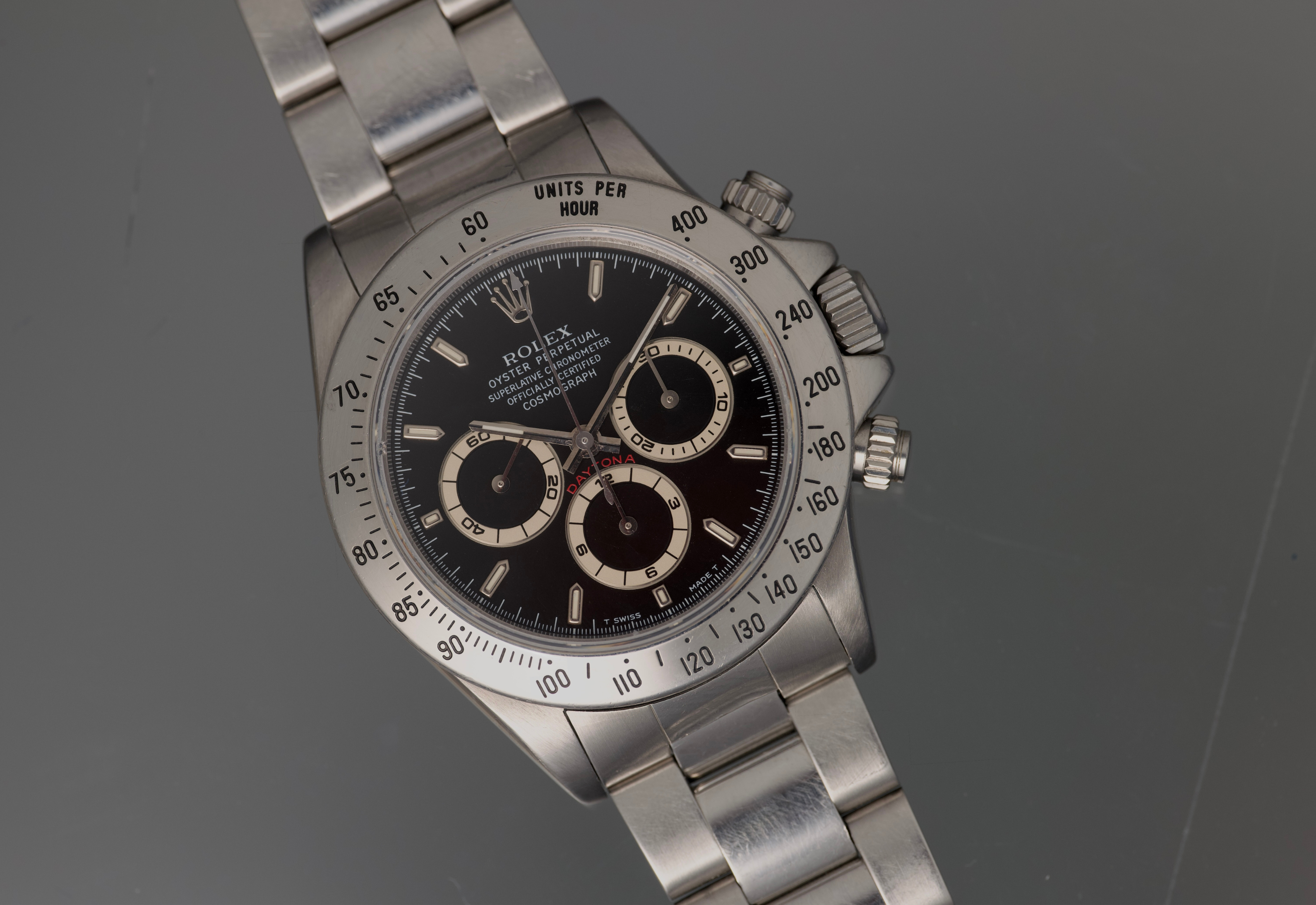 here we have a nicely preserved 16520 zenith Daytona from 1996. The tritium dial and hands are in excellent shape without issues and the sundials have started to age to a cream color . The case is a little worn but possibly not polished., The bezel is well defined with all paint in tact. The bracelet is original with very little stretch, the correct endlinks and has all its links. The movement is running well and keeping excellent time however last service is unknown. Comes with box, manual , papers, hang tag. Get em before they skyrocket.