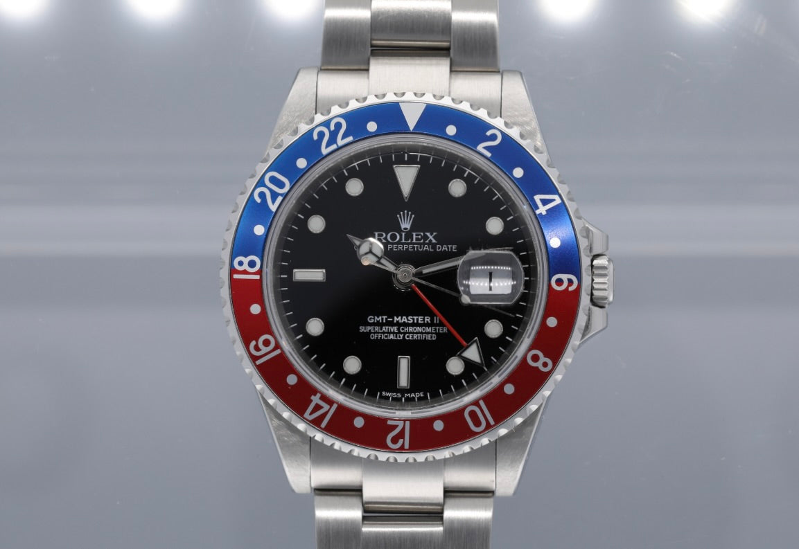 absolutely mint 2007 16710 GMT Stick or "error" dial. Very collectible and very hard to find. This is the first iteration with the 3185 movement. The dial and hands are perfect. case looks to have the original finish and has barely any marks. The insert is like new and the bracelet is original and tight. The watch comes with box and card. Movement running as it should. highly collectible gmt only due to increase in value.