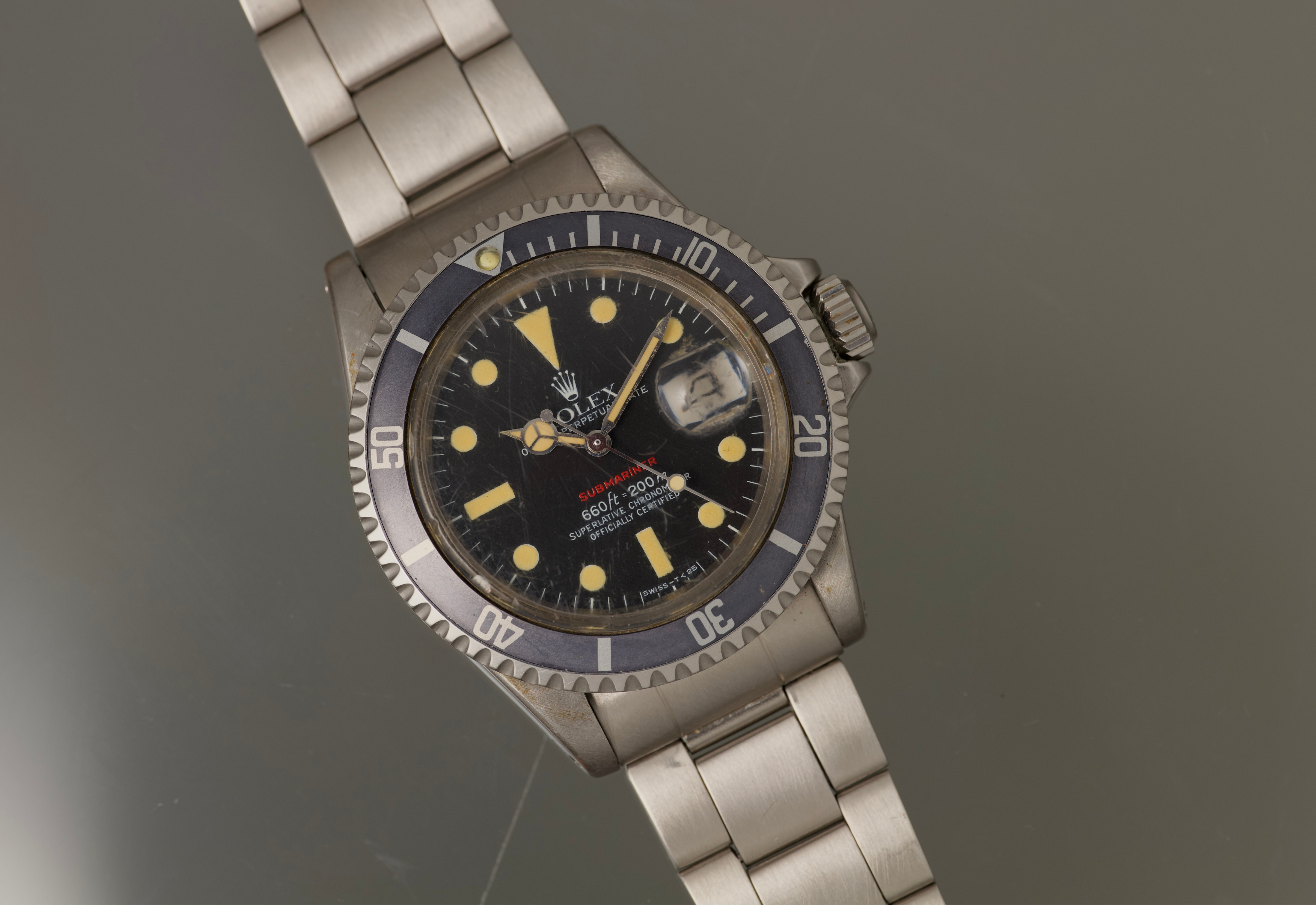 From 1972 we have here a rare find. A red sub with not only a vibrant patina perfect dial and hands but an excellent case which exhibits some wear but possibly not polished. The bezel is sharp and the insert is a wonderful grey blue faded hue. The 9315 bracelet has 12 links and is in nice shape with some play but not too much. The movement is running well and keeping excellent time however the last service is not known. The watch comes complete with box, papers, manuals, hang tags, swim proof tag, polishing cloth and even the original purchase receipt for $328.00 dated 1974. A real collector set. The crystal does have some marks on it but we decided to leave it as is.