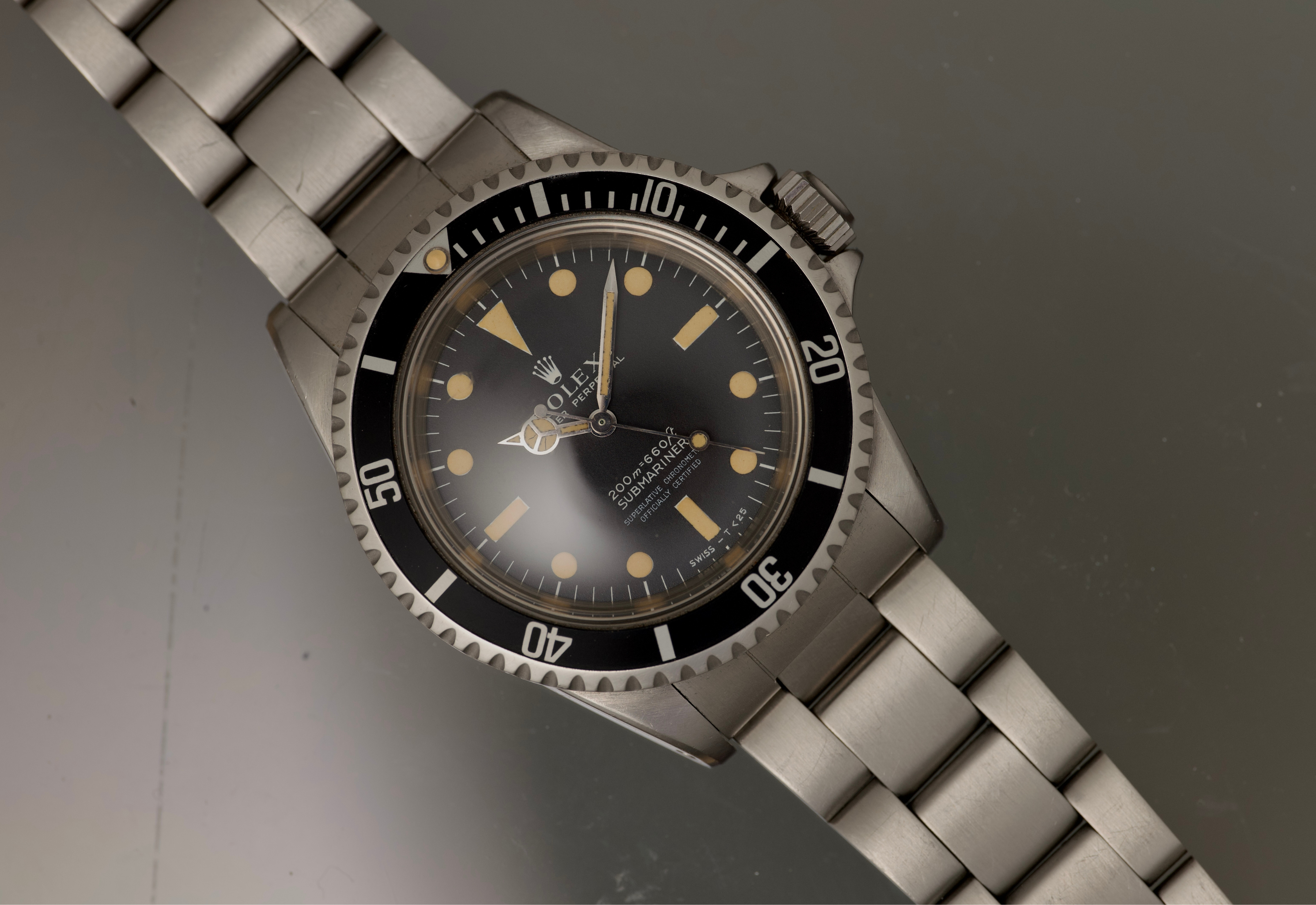 Excellent unpolished 5512 Meters first submariner. The dial and hands are perfect and have developed nice even dark cream patina. The case is sharp and unpolished and has some various areas of wear. The bezel is sharp and the insert is original and mint. The bracelet is later 91350 in excellent condition with very little stretch. The movement was serviced in the last year and is running strong and keeping excellent time. no box or papers included
