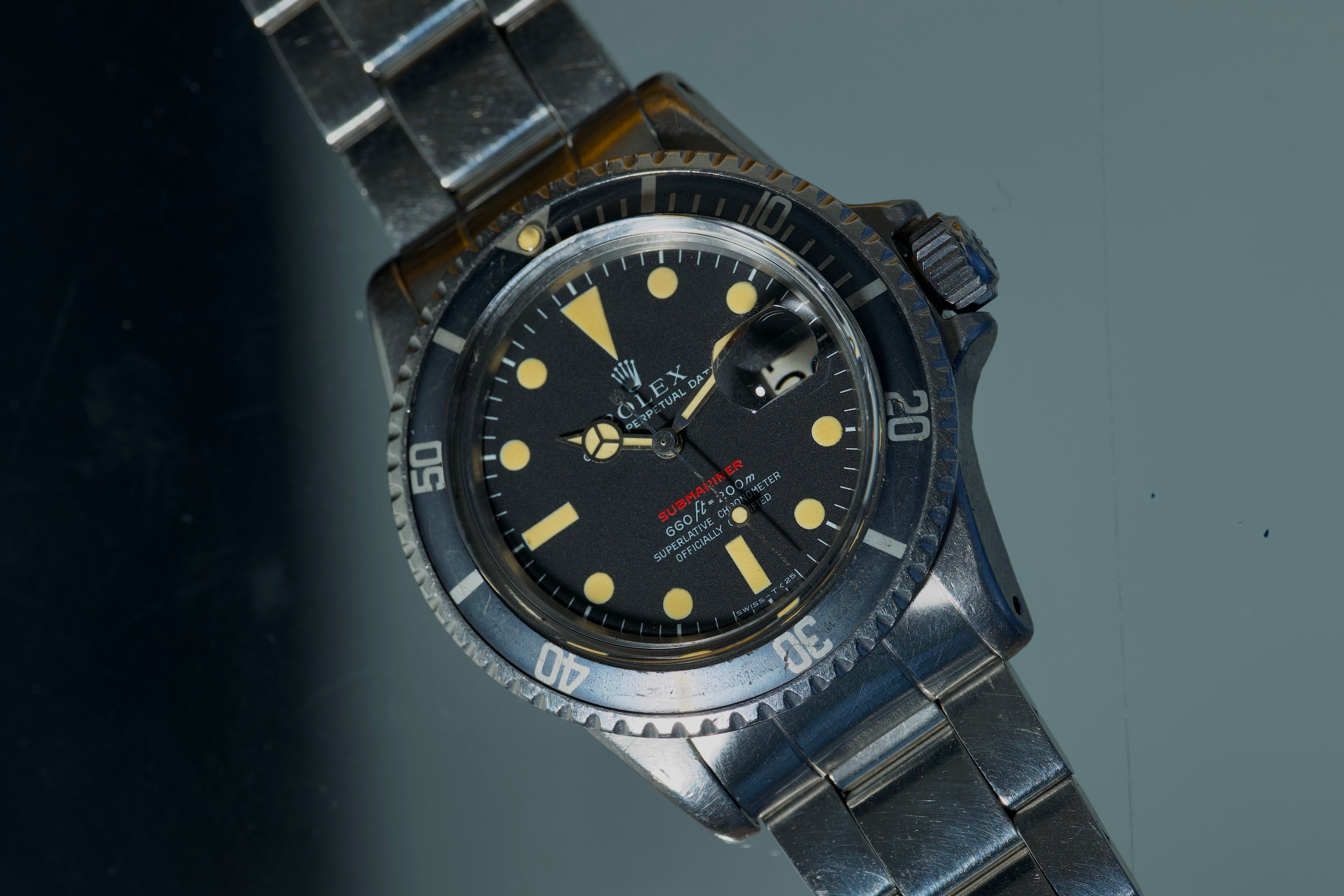 one owner 1680 Red Submariner from 1973. The dial and hands are superb with amazing patina. The case is well worn however unpolished and original bevels are apparent and serial and ref number fully visible. The bezel is sharp and the fat font insert has faded to a very cool blue/grey color. The Bracelet is a 9315 with 12 links plus diver extension with 380 endlinks also in nice shape. The watch was just serviced, a new original top hat crystal was installed. A super nice example of the iconic red submariner