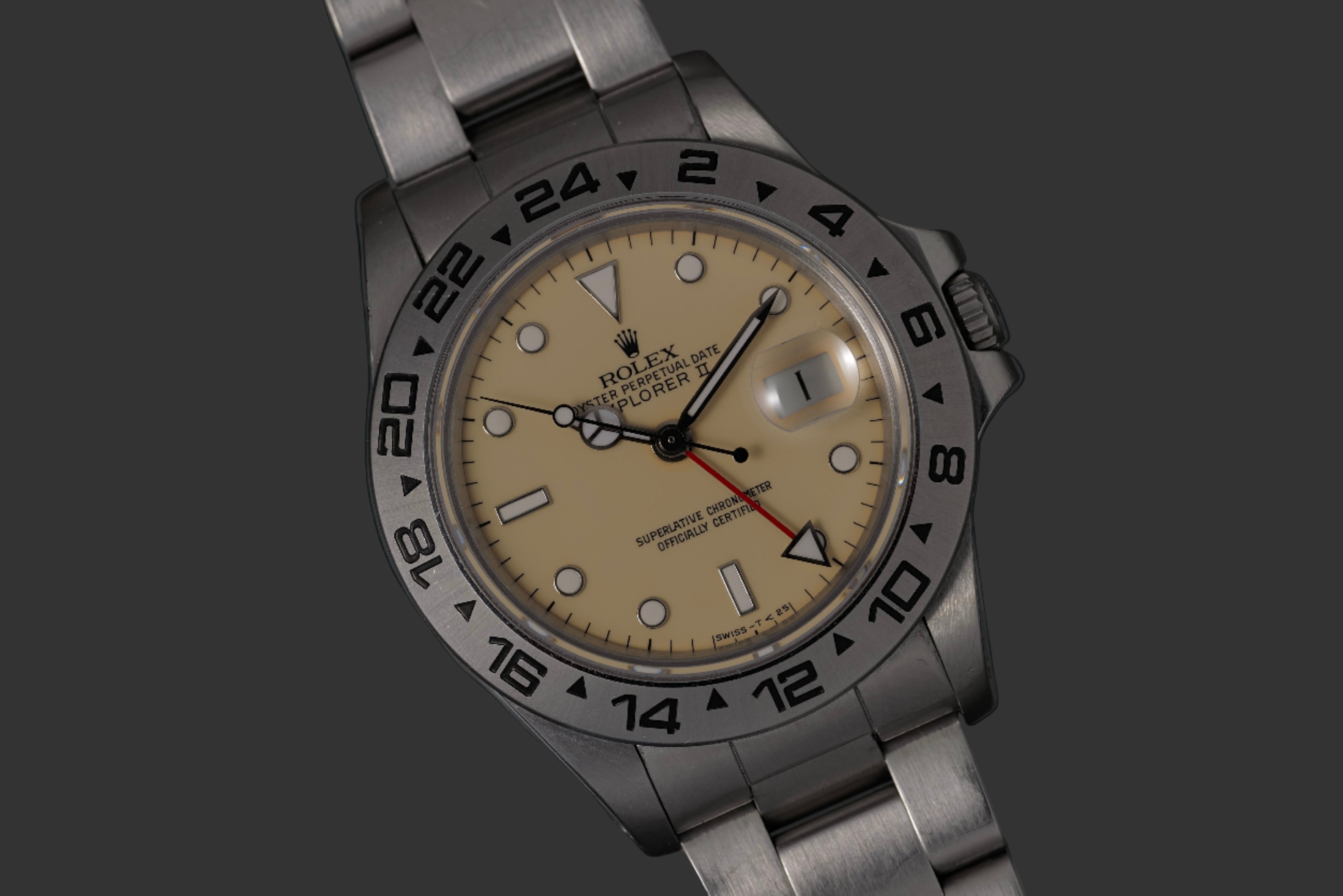 Top condition and exceedingly rare Explorer cream rail dial 16550. The color of this dial is very special and is really underscored by the contrast of the white lume hands which appear to be service. The case was lightly details in its life but remains thick and sharp. The bezel is sharp and the bracelet is tight and original with all of its links. This is a collector's example for sure and anyone would be proud to wear this iconic vintage rolex.