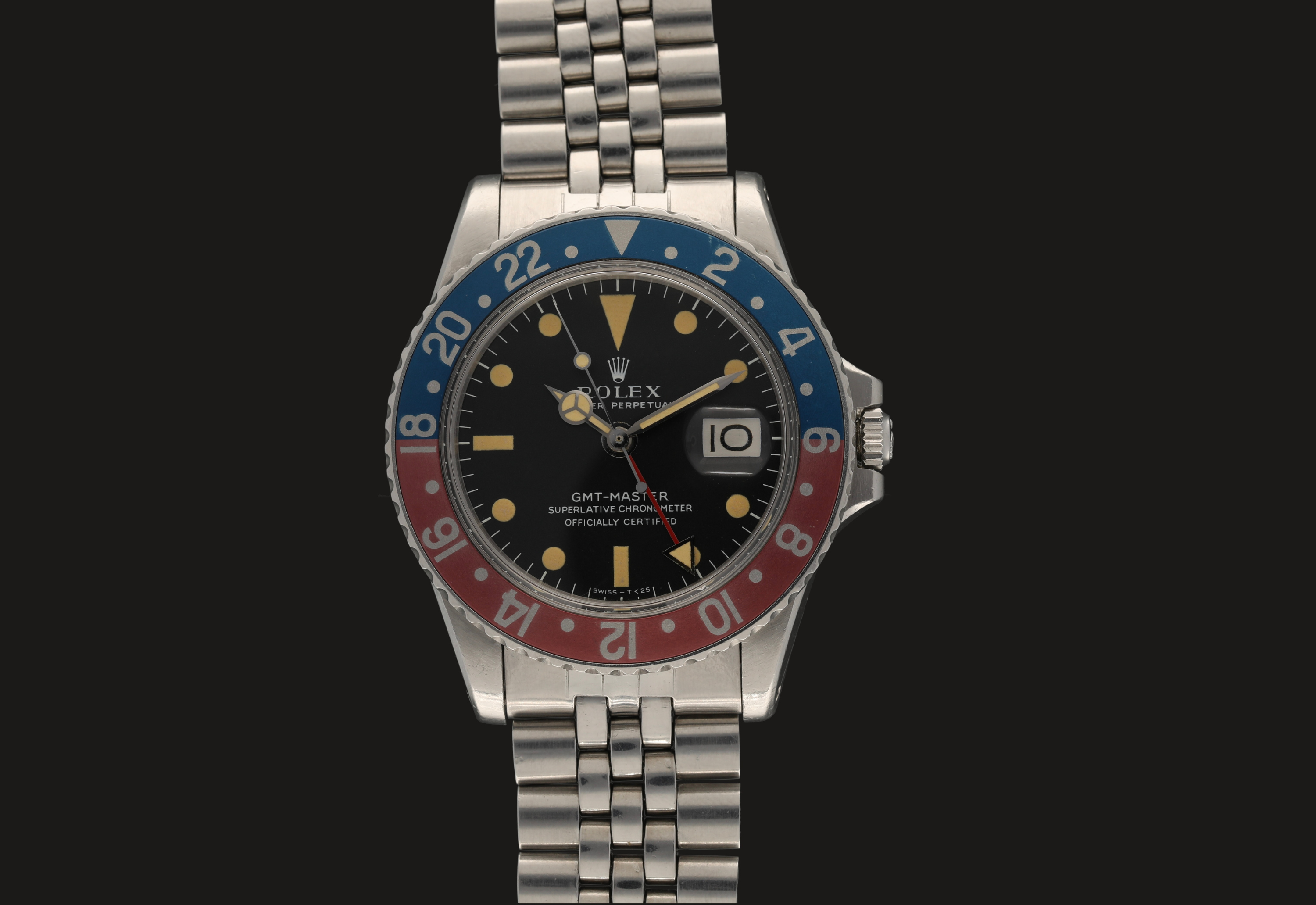 Early 70s MK1 GMT with perfect dial and original matching hands. The case is super sharp and unpolished with big original chamfers. The insert is and incredible faded blue and light red and the original band still has the rare 50 end links. Appears that the clasp was changed probably at service sometime. Comes with its original box