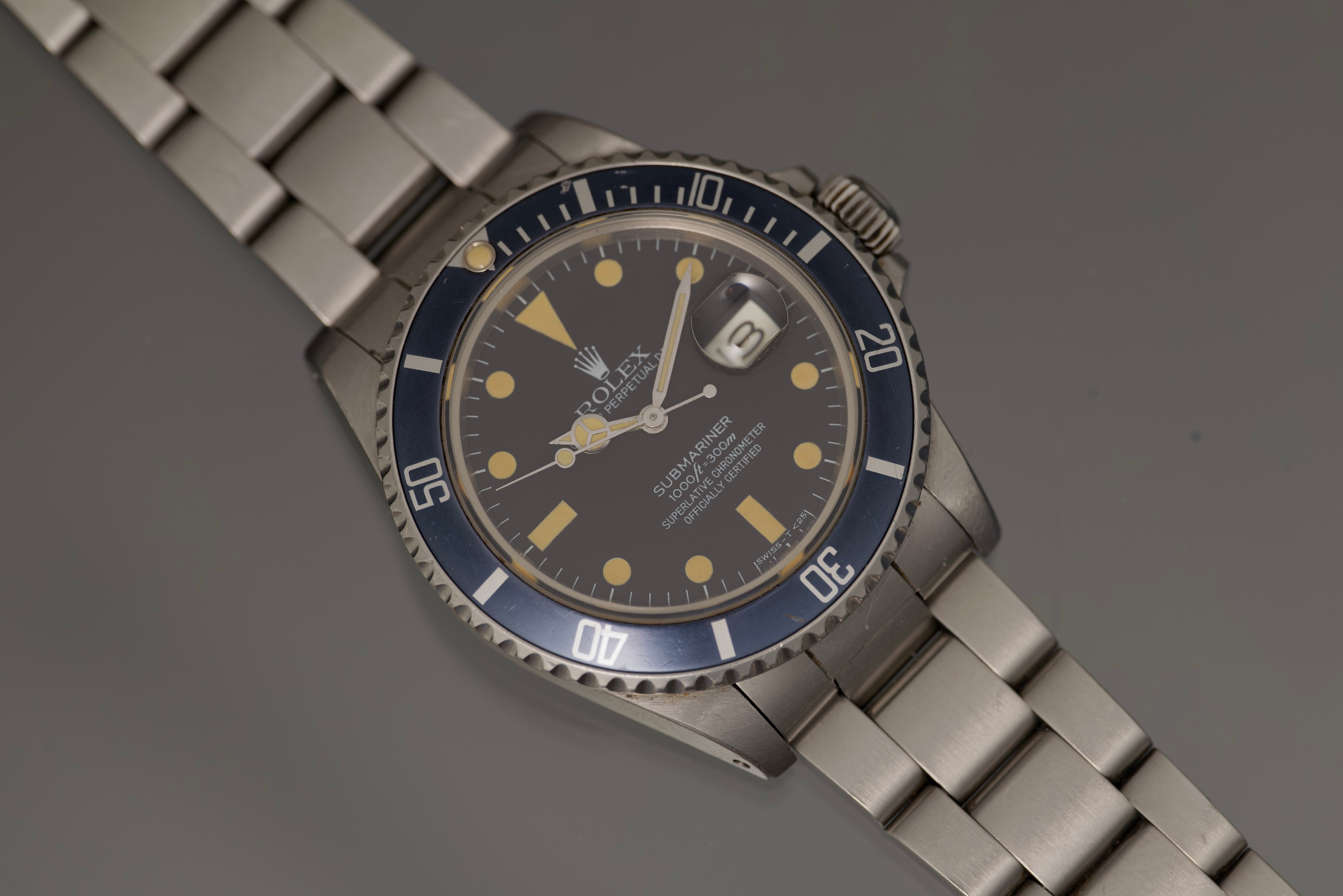 a great example of the transitional 16800 submariner date. The dial and hands are extremely nice and have great patina. The case is unpolished with sharp beveled lugs. The bezel is sharp and the insert has faded to a navy blue. The bracelet is original and fully linked with very little stretch. The movement is running strong and keeping perfect time however last service is unknown.