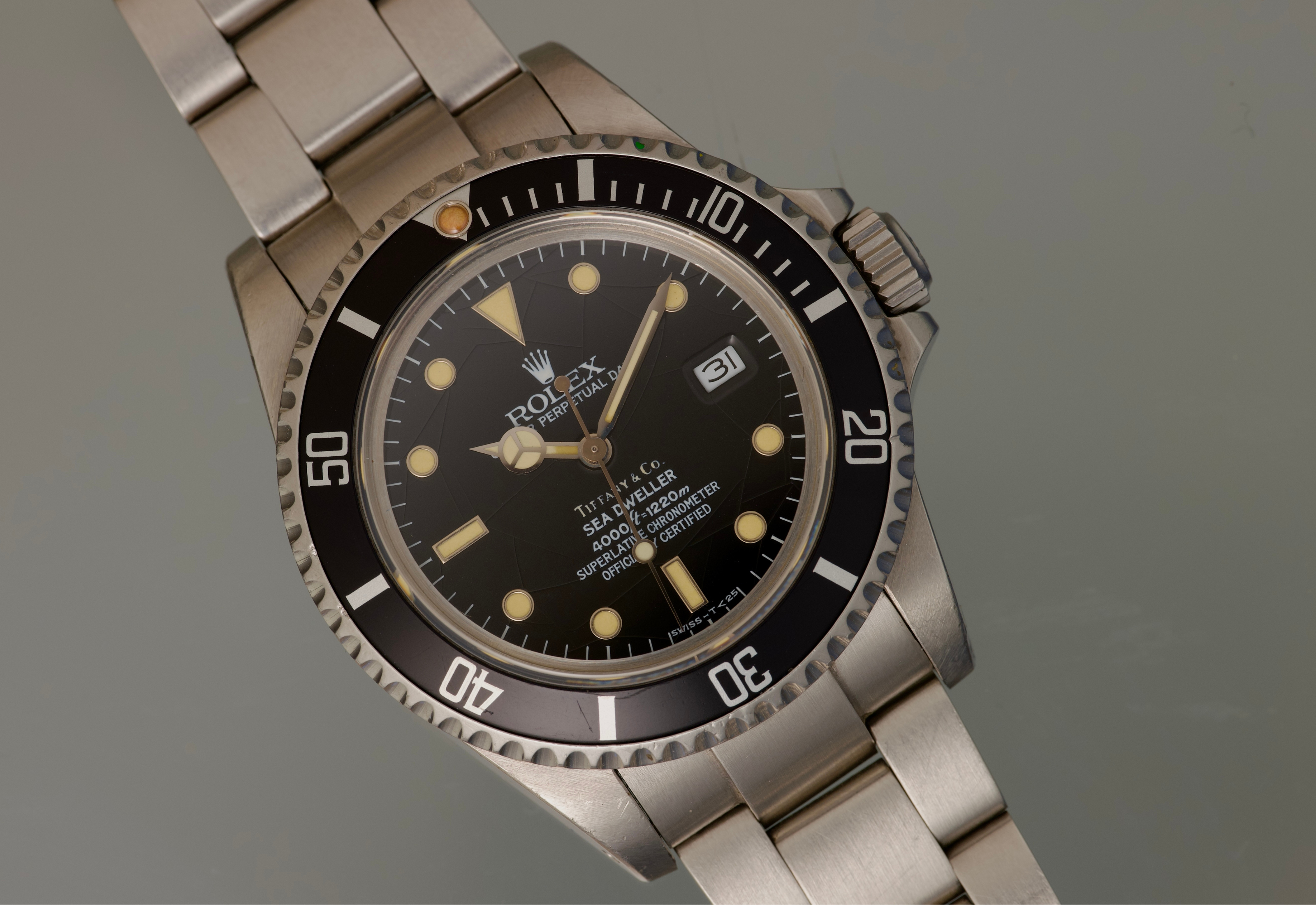 Certainly stunning example of the 16660 transitional Sea-Dweller with a super rare non-hyphen co-branded Tiffany and Company. The dial is rare in its own right but to see it with Tiffany on it is tjust next level. The markers have aged to a vivid pumpkin patina and the entire surface of the dial is perfect with some spidering and the hands match nicely The case is sharp and has never been polished with the original chamfers visible - there is however wear and scrapes consistent with age in certain areas. The bezel is sharp and the insert is in great condition. The bracelet is original and tight with all of its links. The movement is running strong and keeping excellent time but could use a basic overhaul. comes as watch only. A new crystal was just installed.